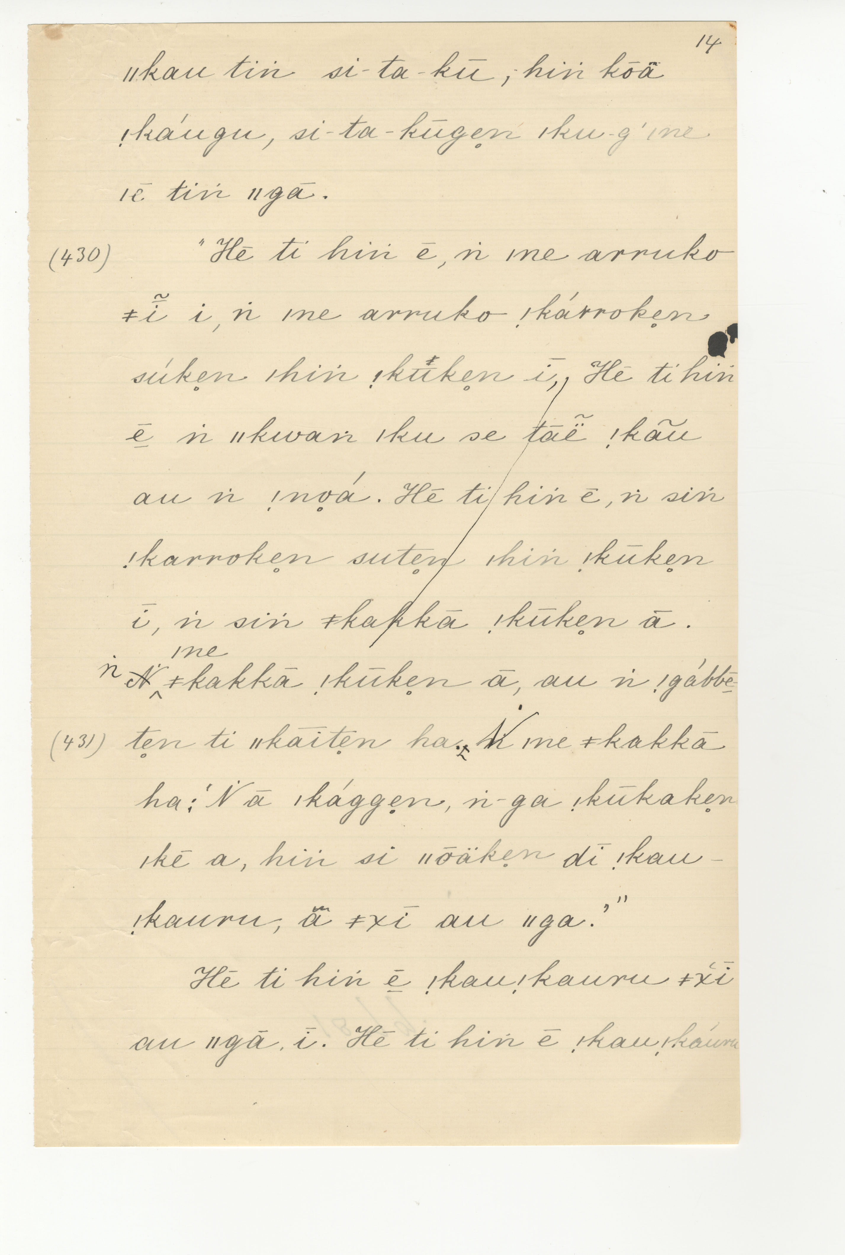 Manuscript page taken from ǁkabbo's story, |kaggen (the Mantis) and the Moon (version 1) -- in Bleek notebook 3 (dated 1871, 1872, 1873 [notes added]), pages (continuing from) 429 to 431.