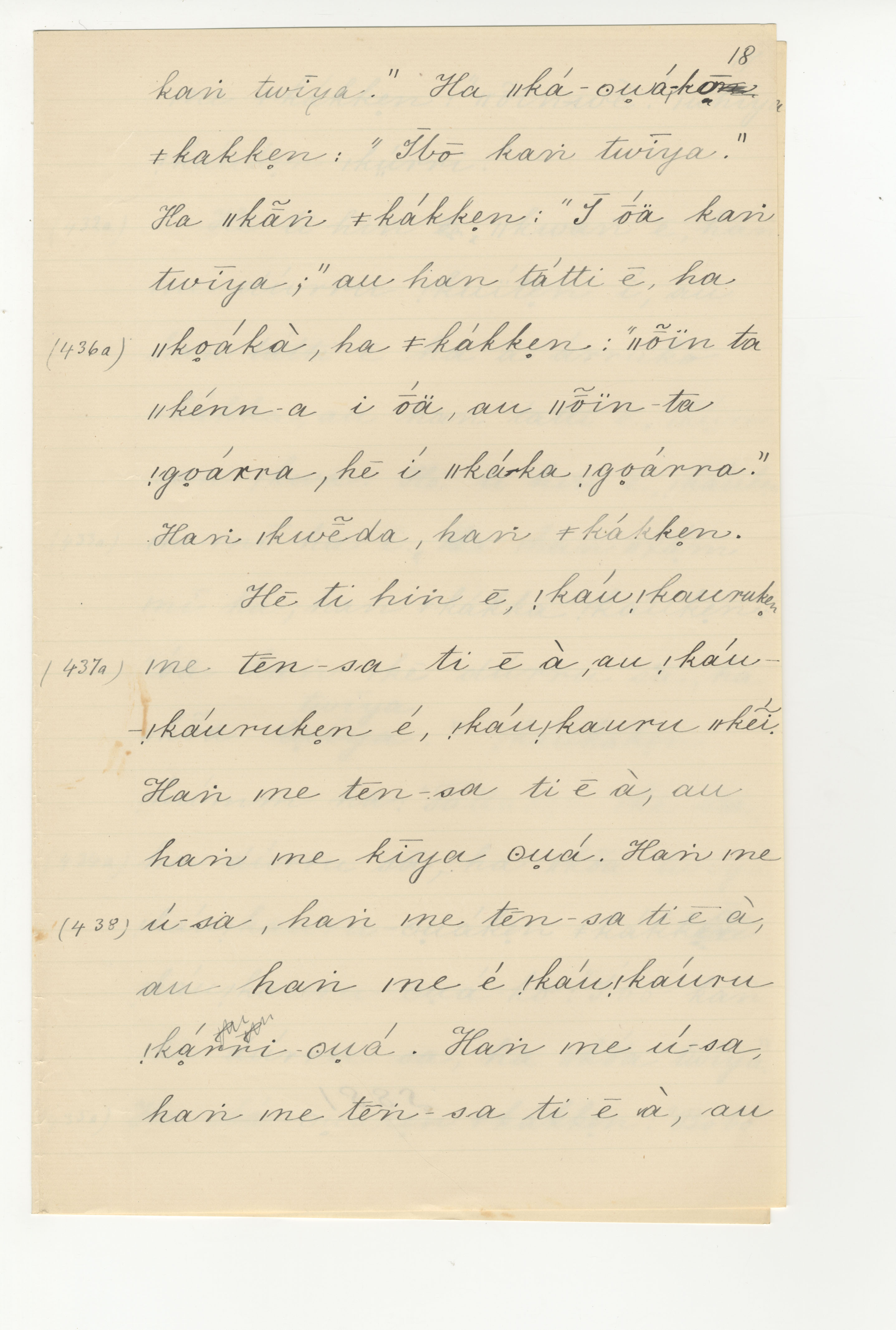 Manuscript page taken from ǁkabbo's story, |kaggen (the Mantis) and the Moon (version 1) -- in Bleek notebook 3 (dated 1871, 1872, 1873 [notes added]), pages (continuing from) 435a (through 436a and 437a) to 438.