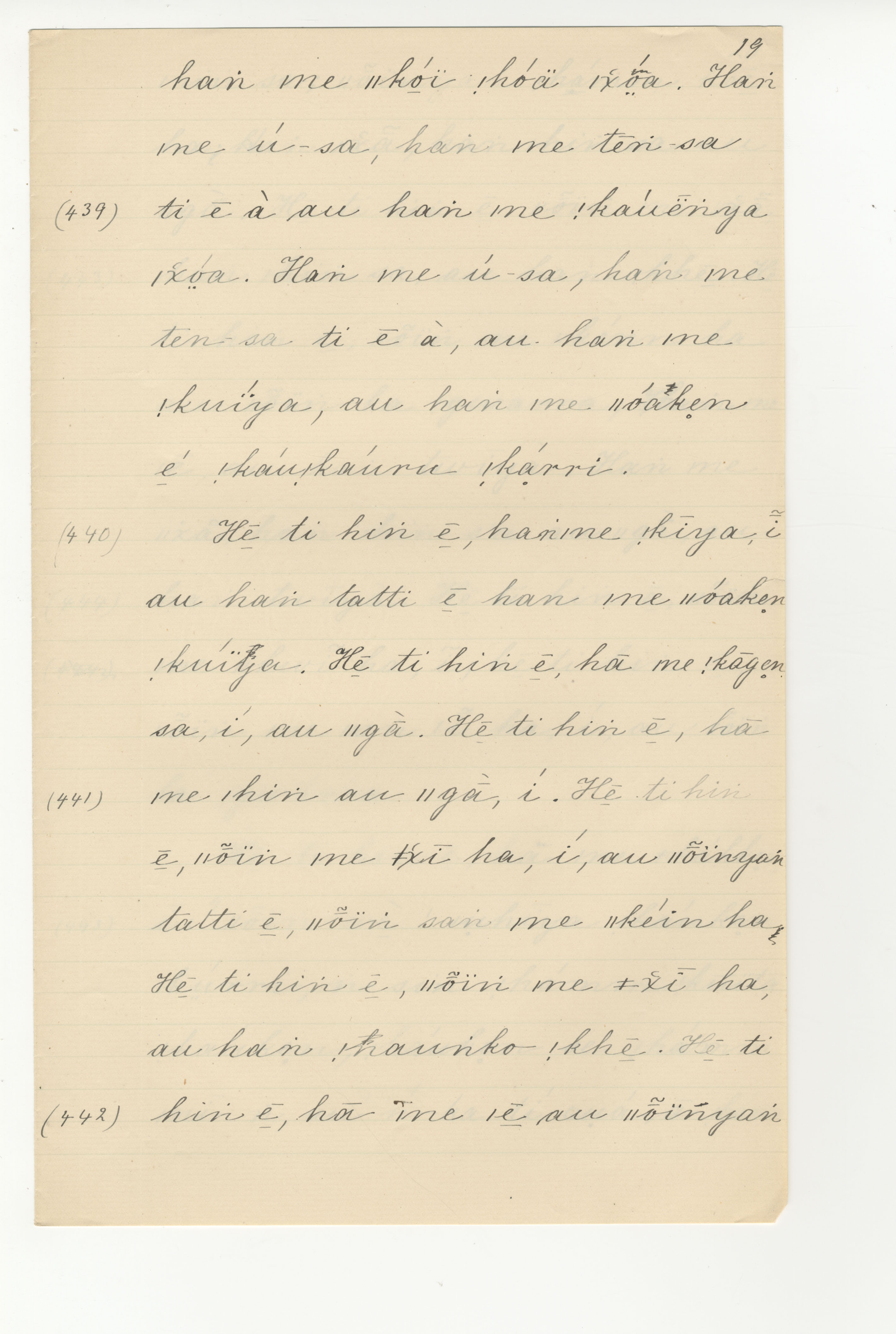 Manuscript page taken from ǁkabbo's story, |kaggen (the Mantis) and the Moon (version 1) -- in Bleek notebook 3 (dated 1871, 1872, 1873 [notes added]), pages (continuing from) 438 to 442.