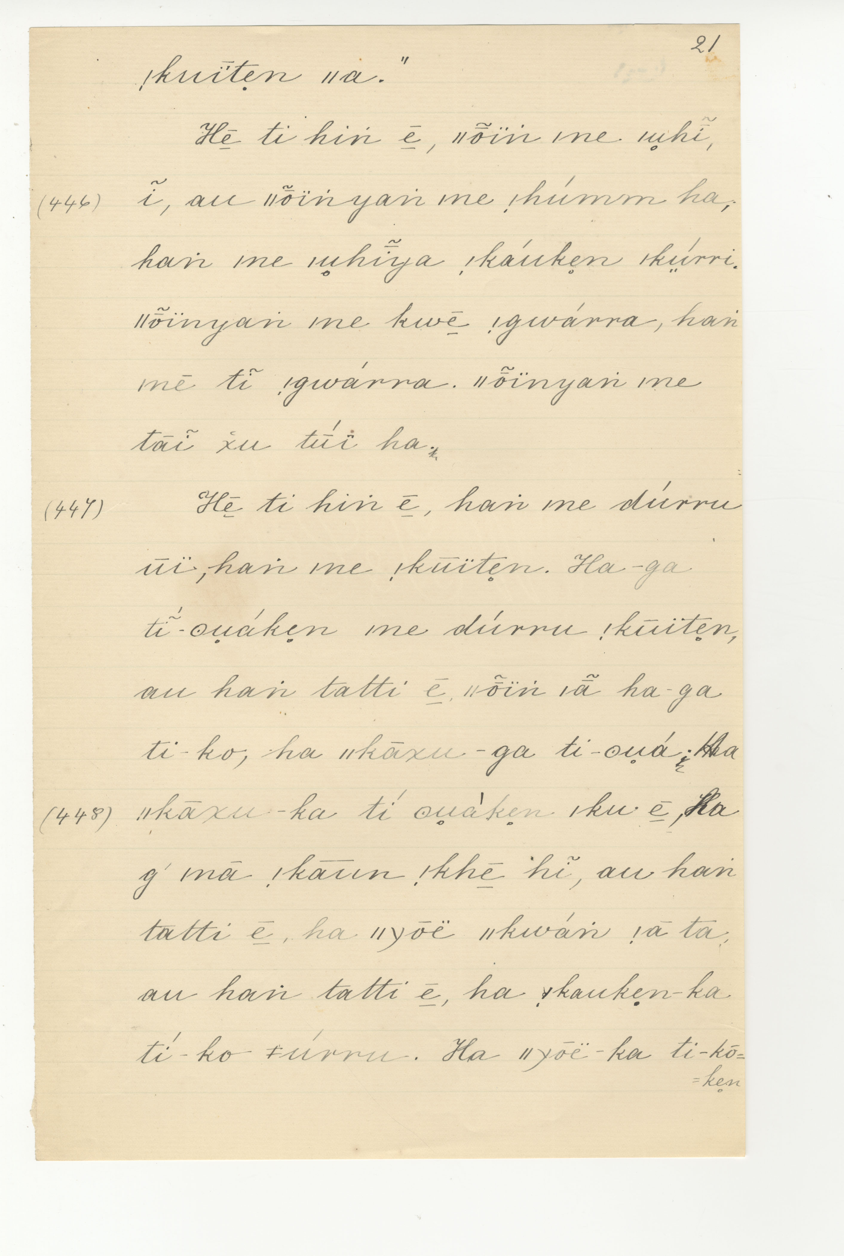 Manuscript page taken from ǁkabbo's story, |kaggen (the Mantis) and the Moon (version 1) -- in Bleek notebook 3 (dated 1871, 1872, 1873 [notes added]), pages (continuing from) 445 to 448.