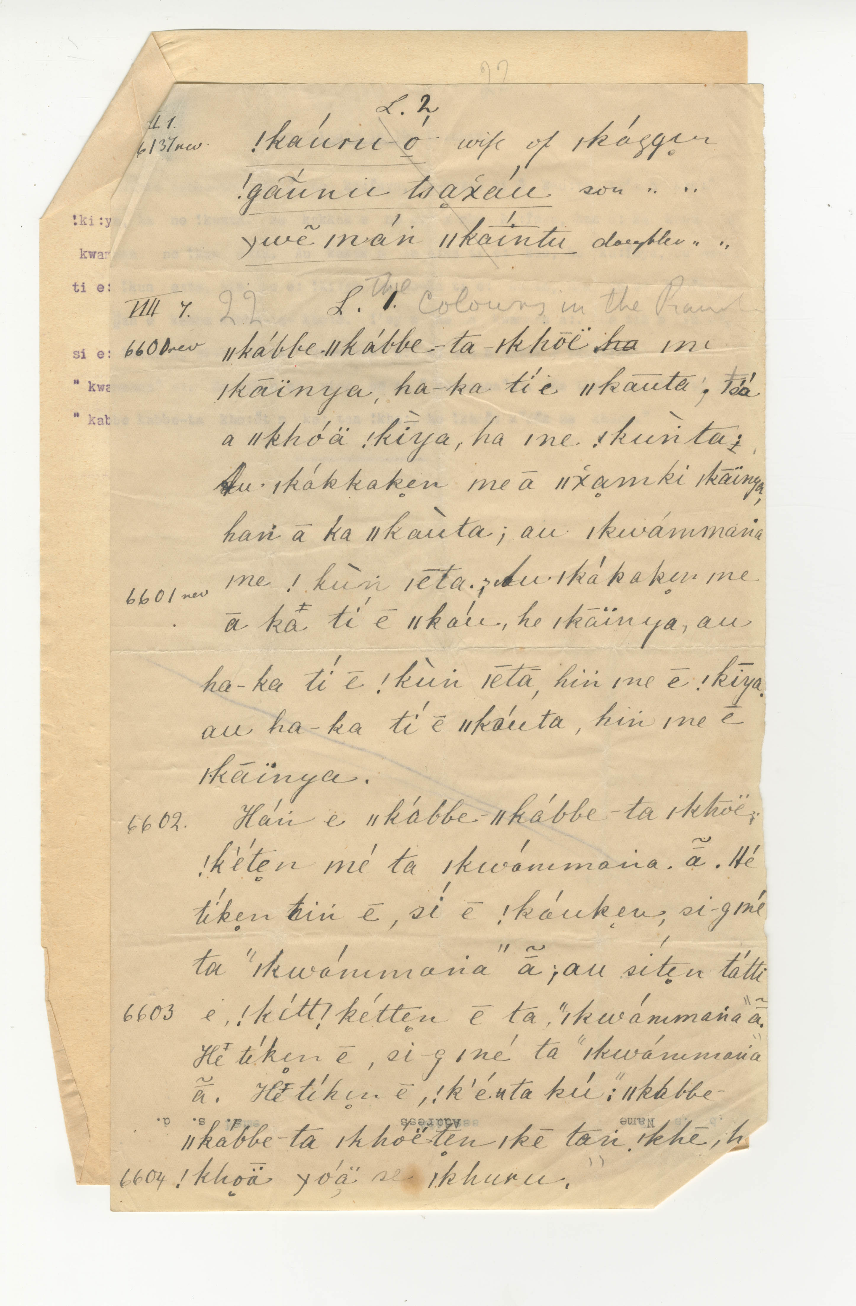 Manuscript page taken from |han≠kass'o's story, The name of |kaggen's wife, son and daughter -- in Lloyd notebook 1 (dated 1878), page 6137 rev. and Rainbow (|kaggen and !kwammana) -- in Lloyd notebook 7 (dated 1878), pages 6600 to 6604.