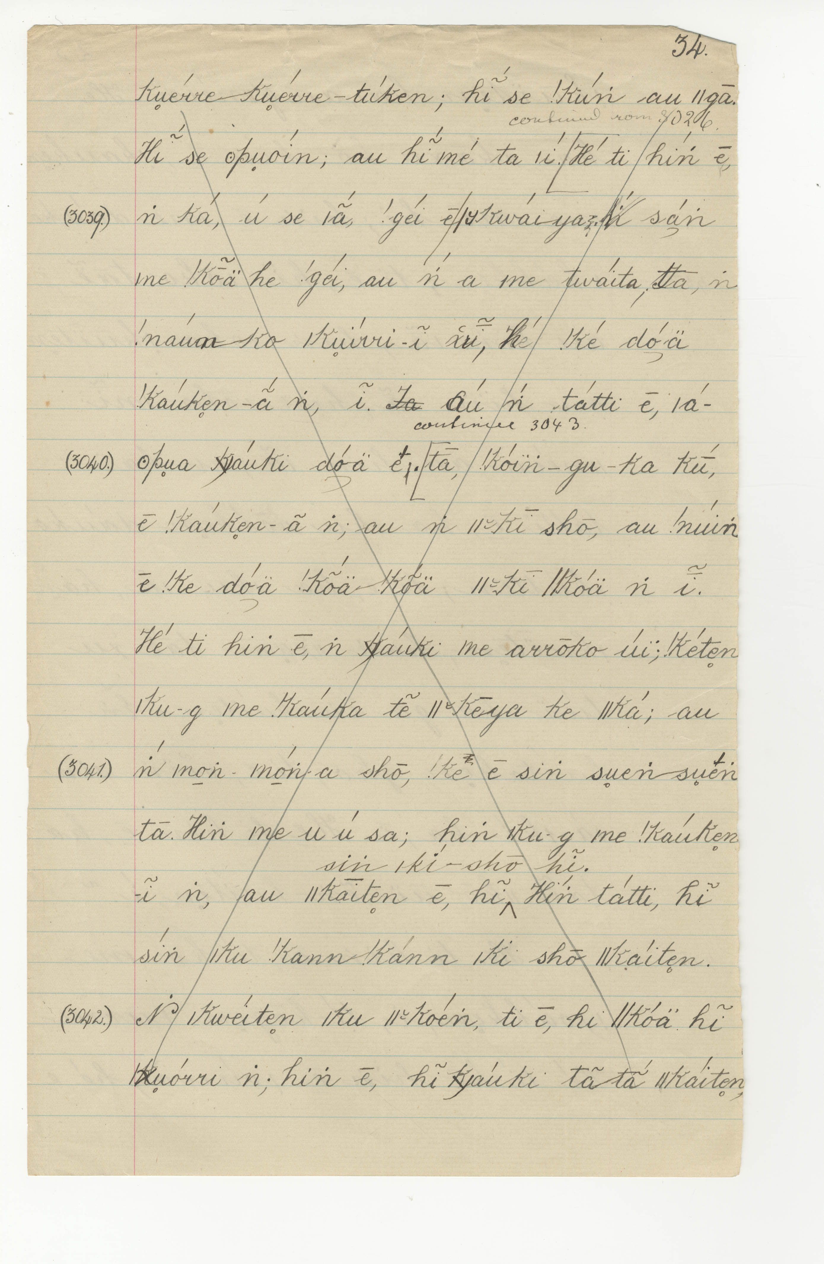 Manuscript page taken from ǁkabbo's story, The Mantis takes away the Tick's sheep (including Porcupine's speech concerning the coming of ǁkhwai-hemm) -- in Lloyd notebook (dated 1873), pages (continuing from) 3038 to 3042.