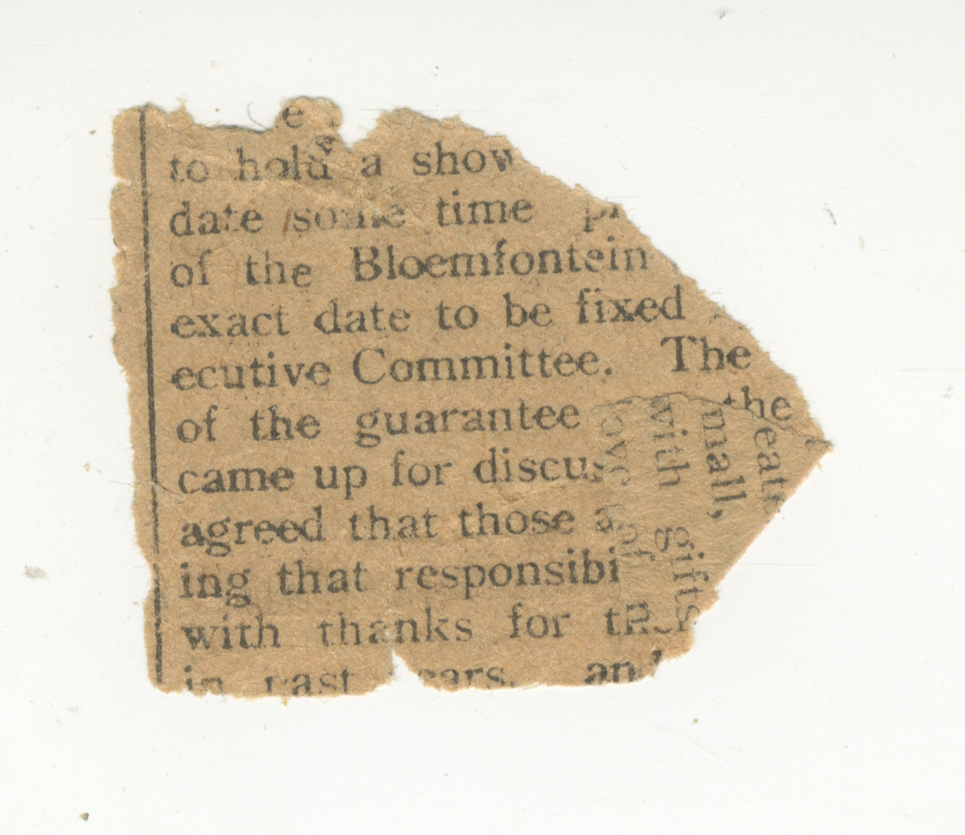 The fragment appears to speak to the holding of a show in or around Bloemfontein at a date still to be decided ('fixed') by an Executive Committee, with some further mention of a 'guarantee' coming up for discussion. It goes on to mention some sort of agreement being discussed or reached, alluding to the responsibility/responsibilities of certain (now indiscernible ) actors, and ending with a general vote of thanks (likely for involvement or contributions made 'in past years'). Pages numbers and publication outlet unknown (other newspaper fragments appear with D3.4.1).
