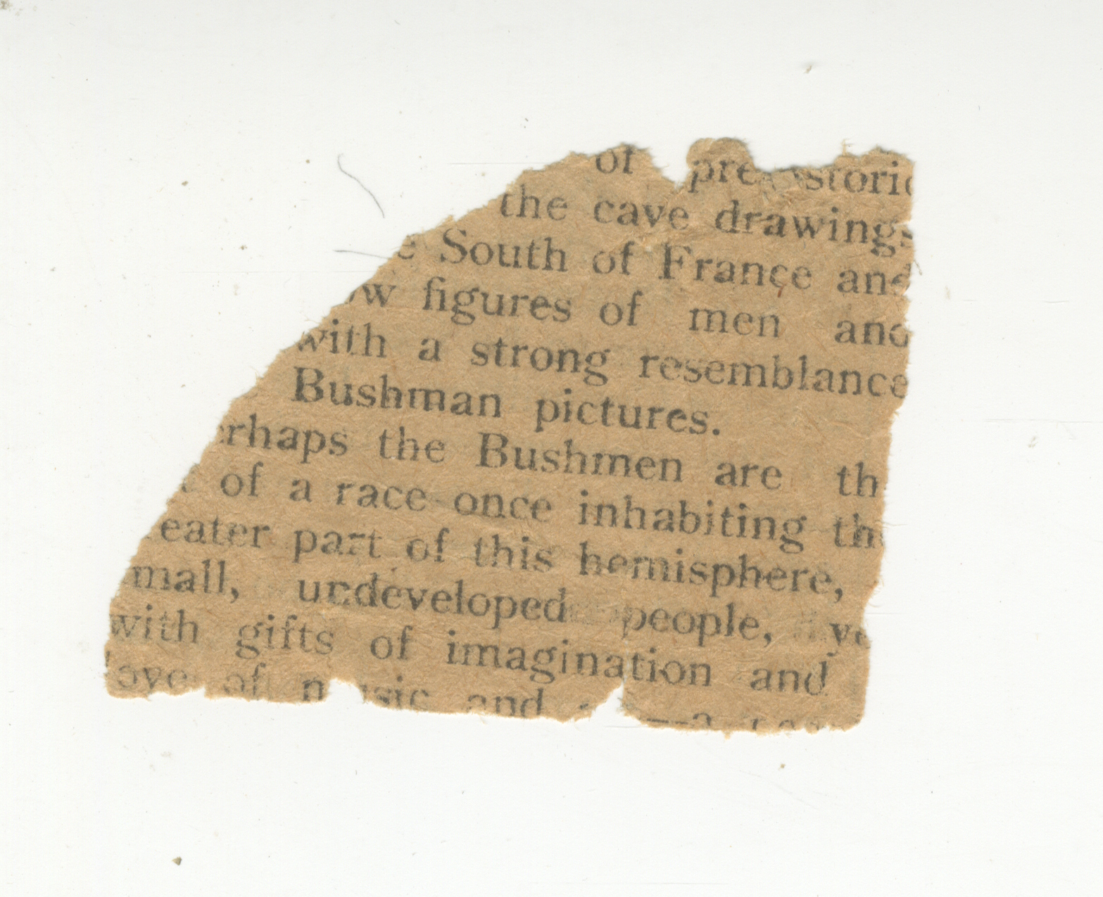 The fragment appears to speak to parallels drawn between 'cave drawings [in the] South of France' and Bushman pictures -- submitting that their 'figures of men' (full sentence lost) share a strong resemblance (?). It goes on to say that 'perhaps the Bushmen are the [...] of a race once inhabiting th[e] greater part of this hemisphere [...] small, undeveloped people, yet with gifts of imagination and love of music and [...]'. The rest of the fragment's text is missing or too damaged to approximate (other newspaper fragments appear with D3.4.1).