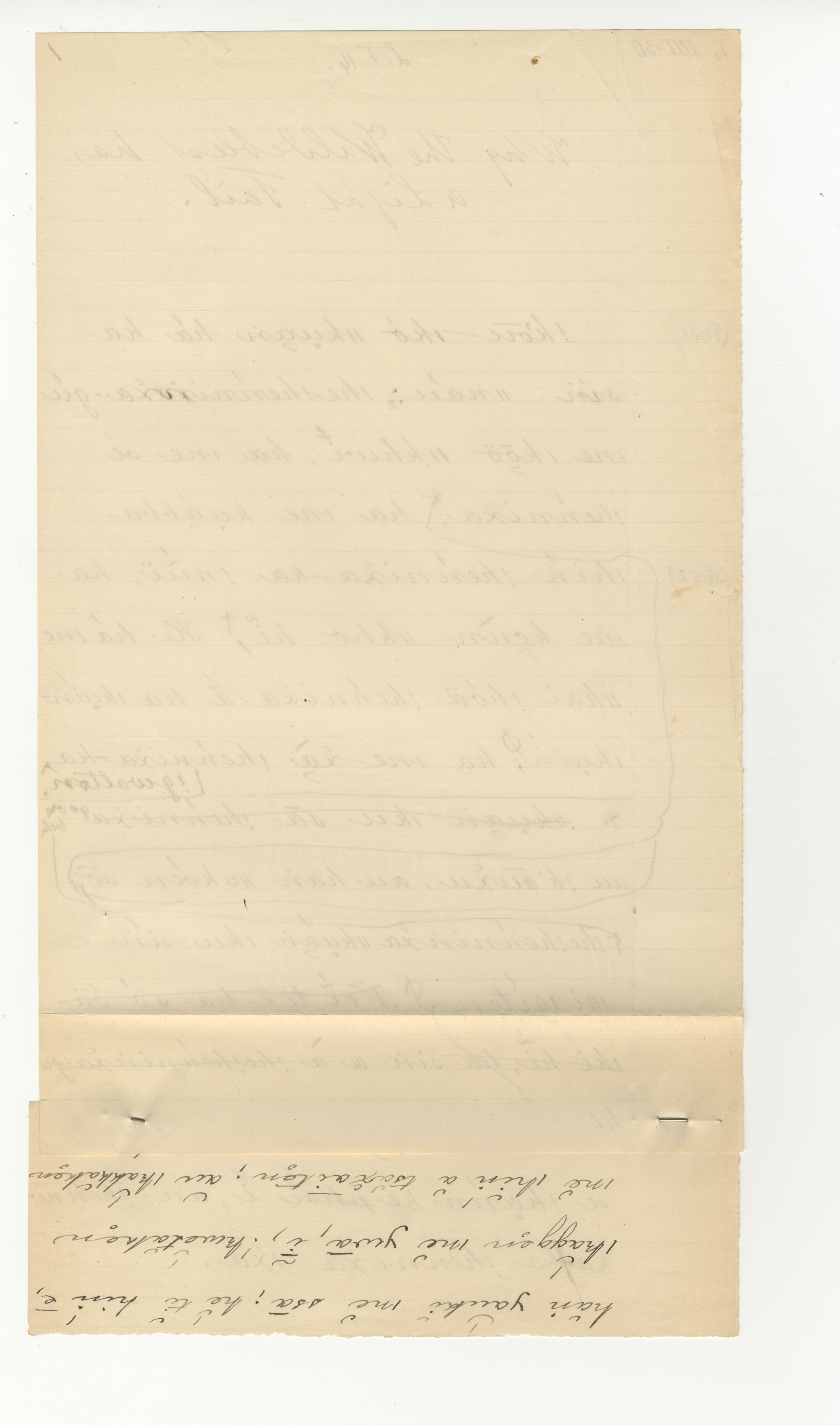 A handwritten page in black ink with four-digit numbers (Lucy Lloyd's notebook pages) in the left margin. A double-sided addendum continuing the text is stapled to the bottom of the page.