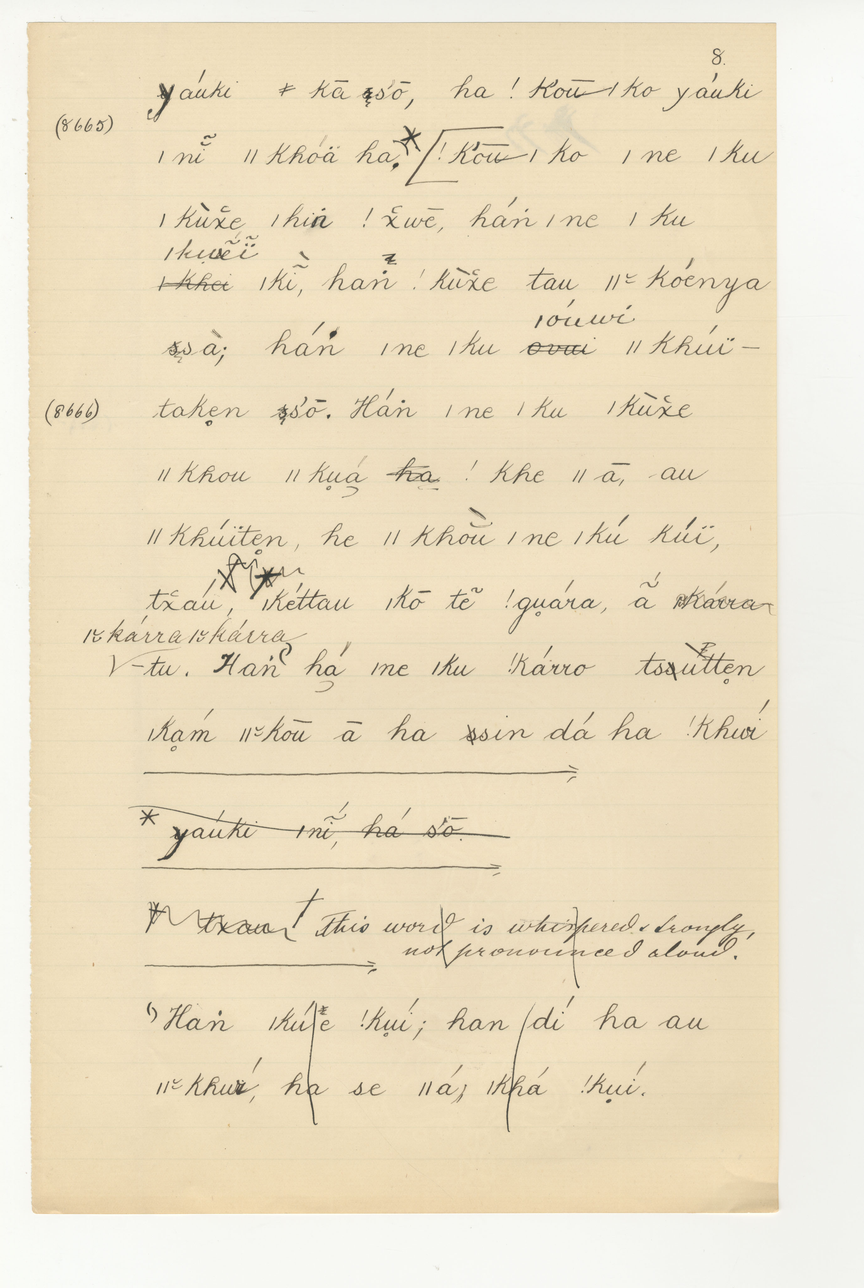 Manuscript page taken from |han≠kass'o's story, The Wildebeest, the Mice, the Quaggas and the Mantis, or why the (black) Wildebeest has a white or light coloured tail -- in Lloyd notebook 30 (dated 1879 [started]), pages (continuing from) 8664 to 8666.