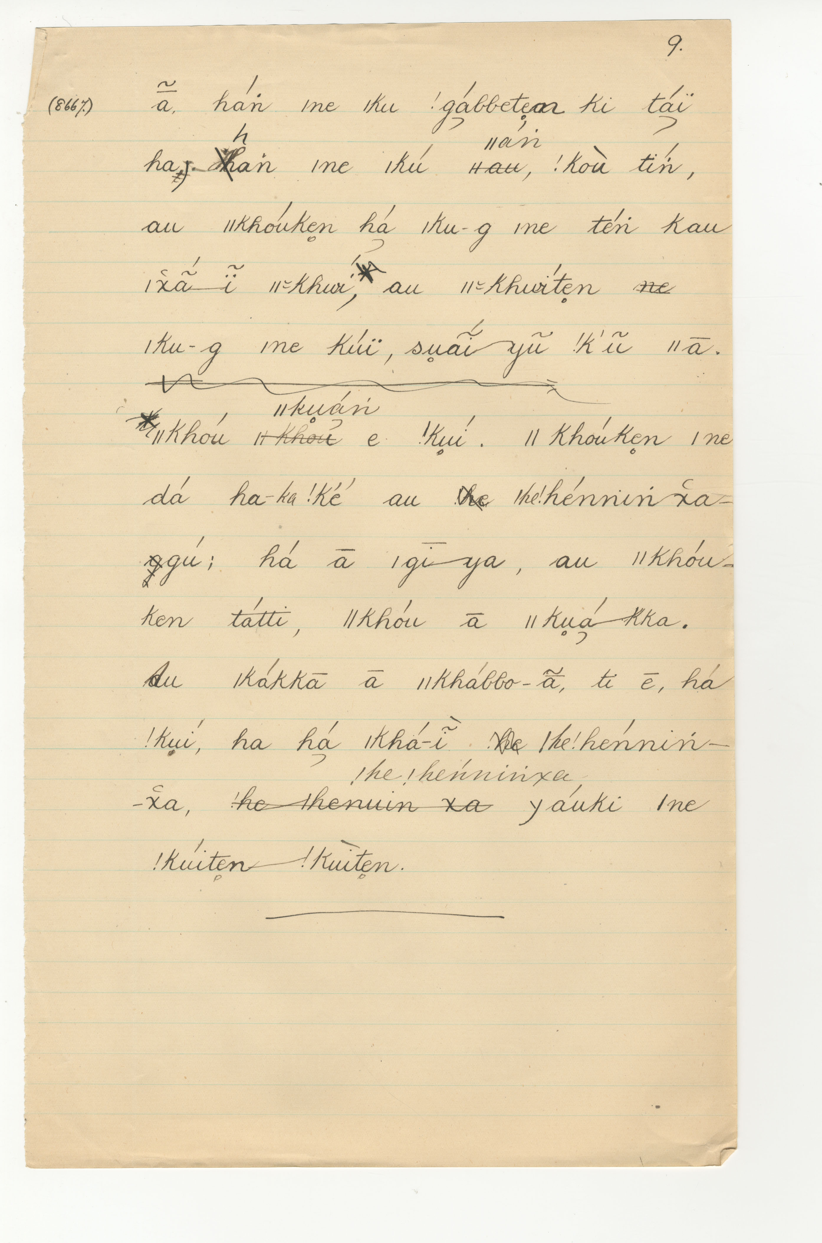 Manuscript page taken from |han≠kass'o's story, The Wildebeest, the Mice, the Quaggas and the Mantis, or why the (black) Wildebeest has a white or light coloured tail -- in Lloyd notebook 30 (dated 1879 [started]), page 8667.