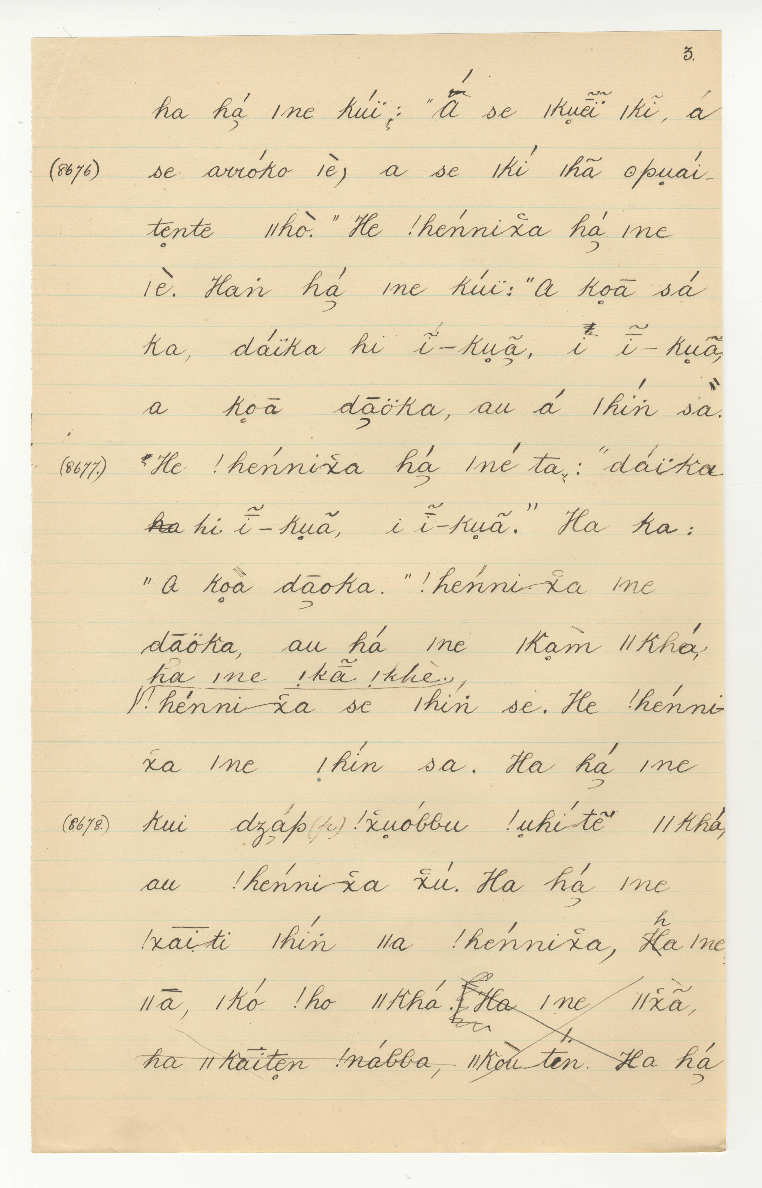 Manuscript page taken from |han≠kass'o's story, The Lizard, the Mice and the Mantis (includes the song of the Agama lizard) -- in Lloyd notebook 30 (dated 1879 [started]), pages (continuing from) 8675 to 8678.