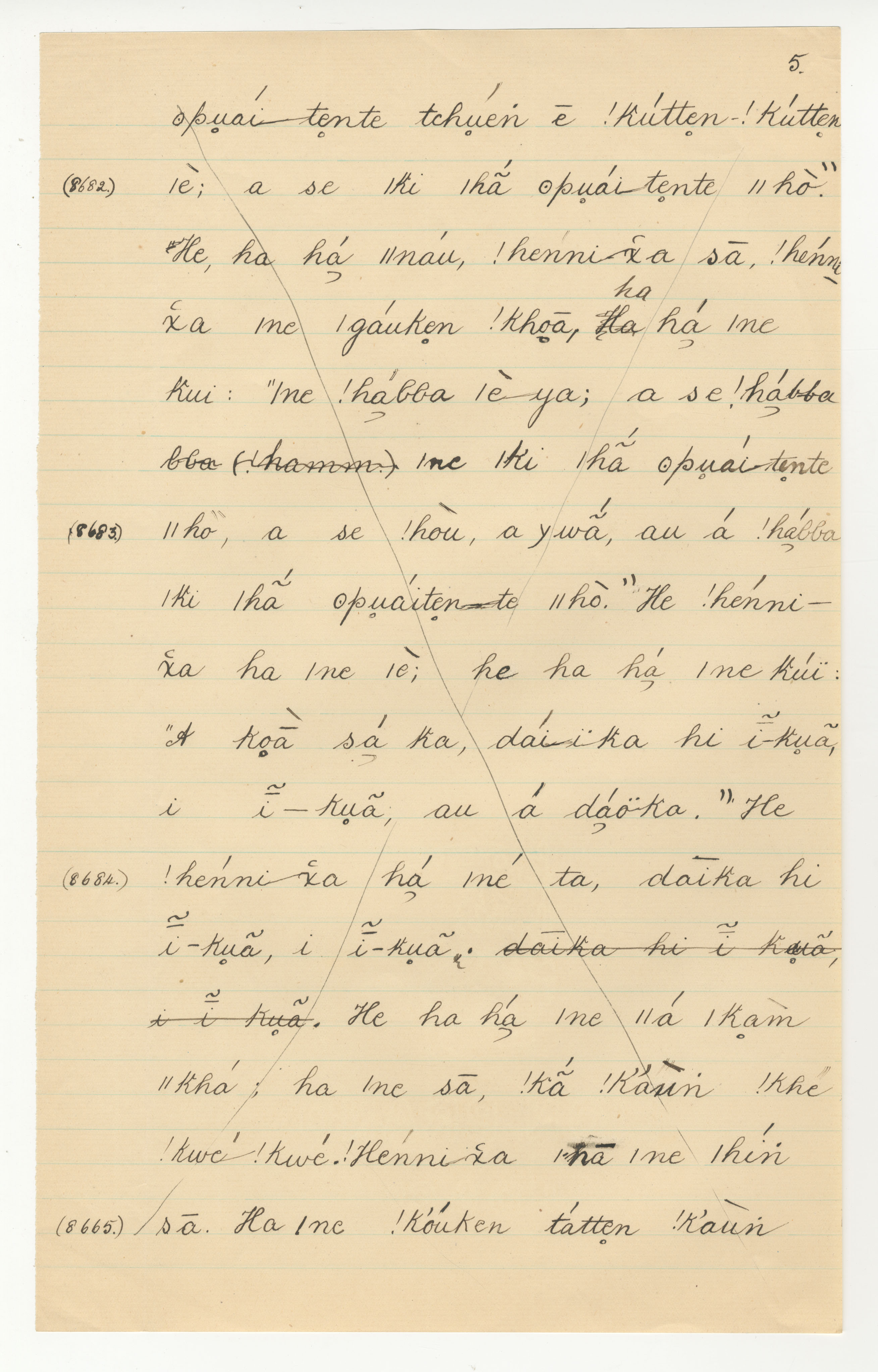 Manuscript page taken from |han≠kass'o's story, The Lizard, the Mice and the Mantis (includes the song of the Agama lizard) -- in Lloyd notebook 30 (dated 1879 [started]), pages (continuing from) 8681 to '8665' (8685? [observable text match]).