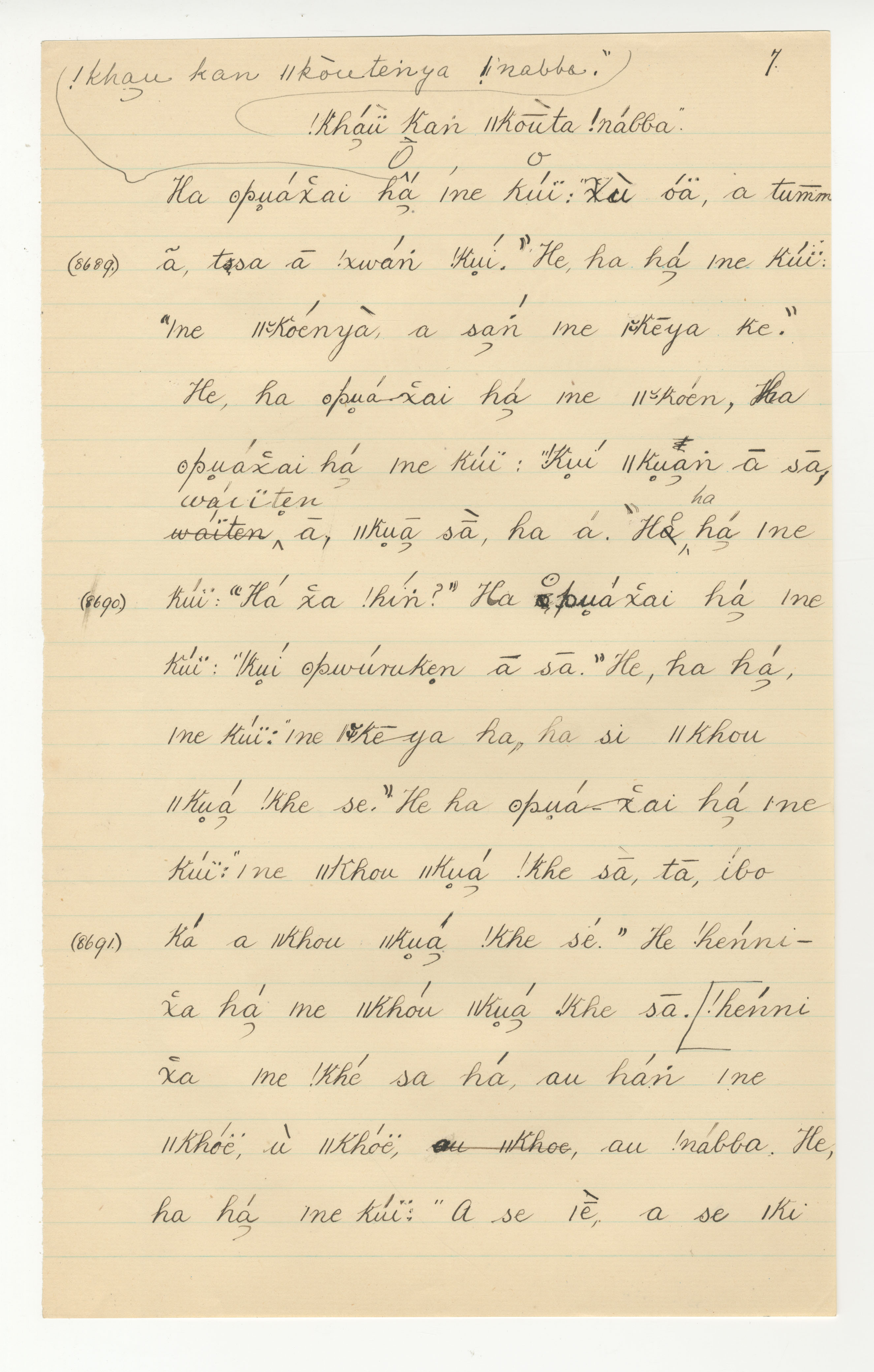 Manuscript page taken from |han≠kass'o's story, The Lizard, the Mice and the Mantis (includes the song of the Agama lizard) -- in Lloyd notebook 30 (dated 1879 [started]), pages (continuing from) 8688 to 8691.