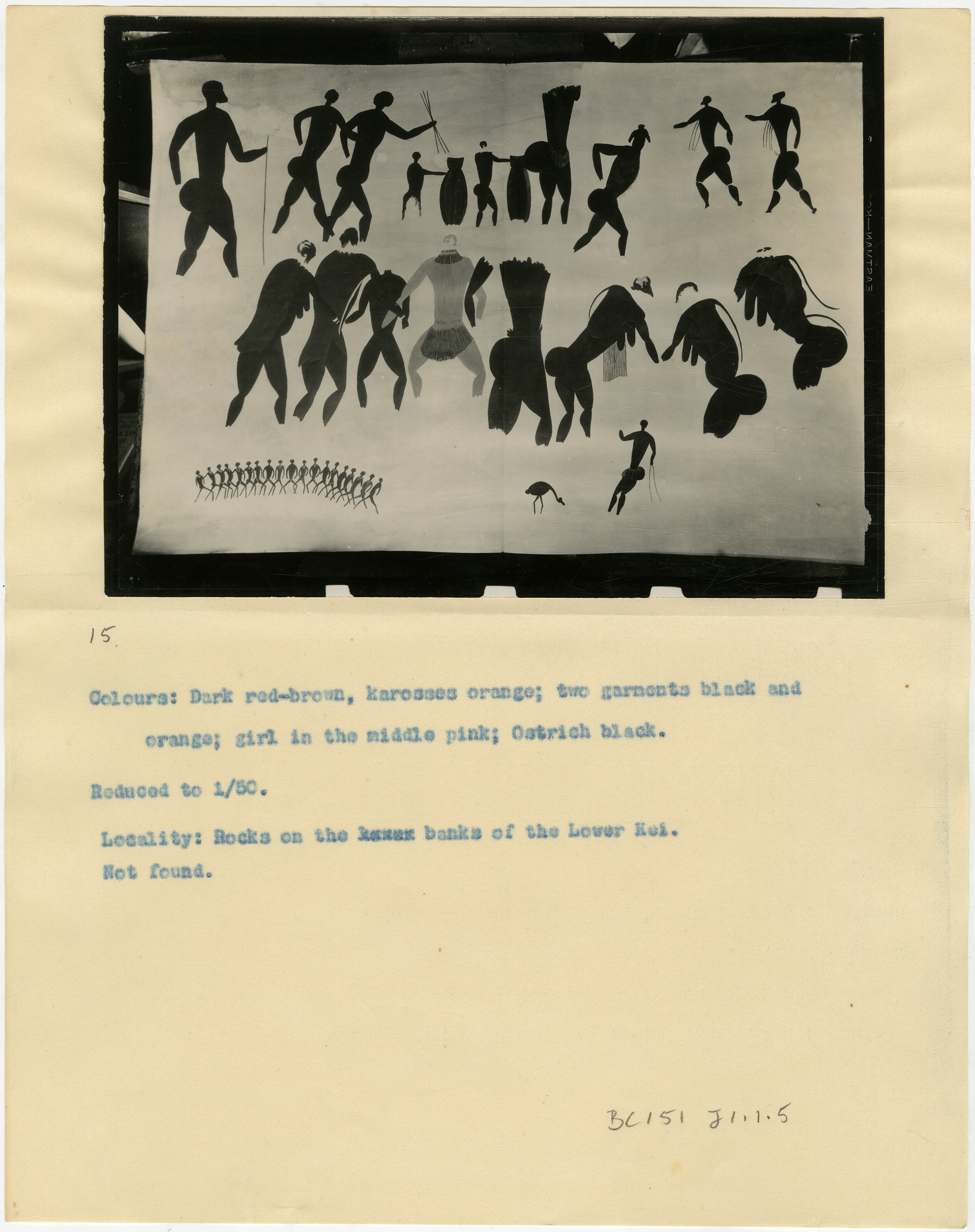 Page is numbered '15' in pencil. Typewritten caption reads: 'Colours: Dark red-brown, karosses orange; two garments black and orange; girl in the middle pink; Ostrich black. Reduced to 1/50. Locality: Rocks on the bank of the Lower Kei. Not found.' Additional text in pencil: 'BC151 J1.1.5'.