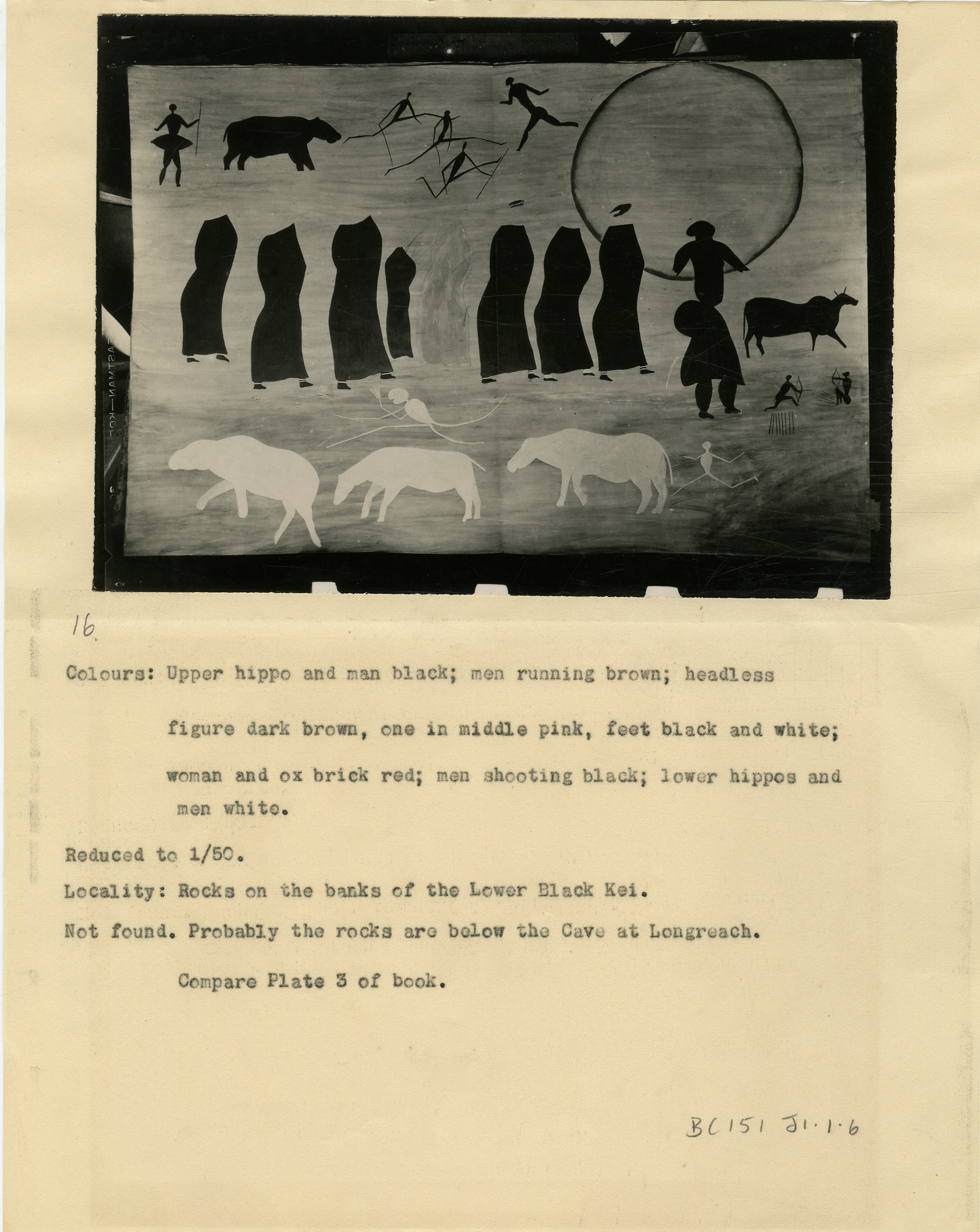 Page is numbered as '16' in pencil. Typewritten caption reads: 'Colours: Upper hippo and man black; men running brown; headless figure dark brown, one in middle pink, feet black and white; woman and ox brick red; men shooting black; lower hippos and men white. Reduced to 1/50. Locality: Rocks on the banks of the Lower Black Kei. Not found. Probably the rocks are below the Cave at Longreach. Compare Plate 3 of book.' Additional text in pencil 'BC151 J1.1.6'.