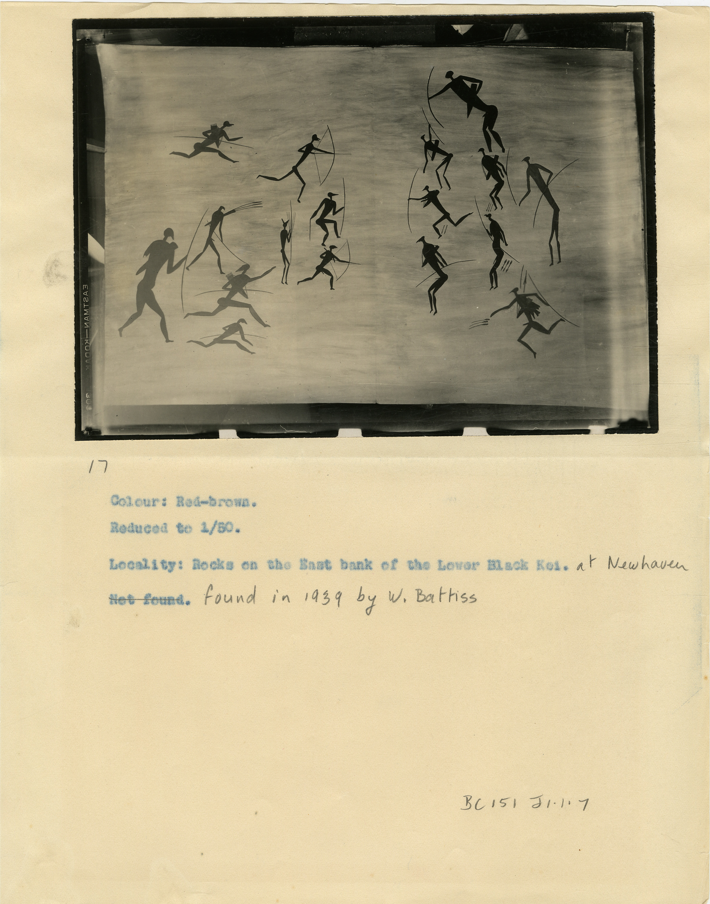 Page numbered '17' in pencil. Typewritten caption reads: 'Colour: Red-brown. Reduced to 1/50. Locality: Rocks on the bank of the Lower Black Kei. Not found.' Additional text in pencil 'at Newhaven'; 'Not found' is crossed out and amended: 'found in 1939 by W. Battiss.' Additional text in pencil: 'BC151 J1.1.7'.