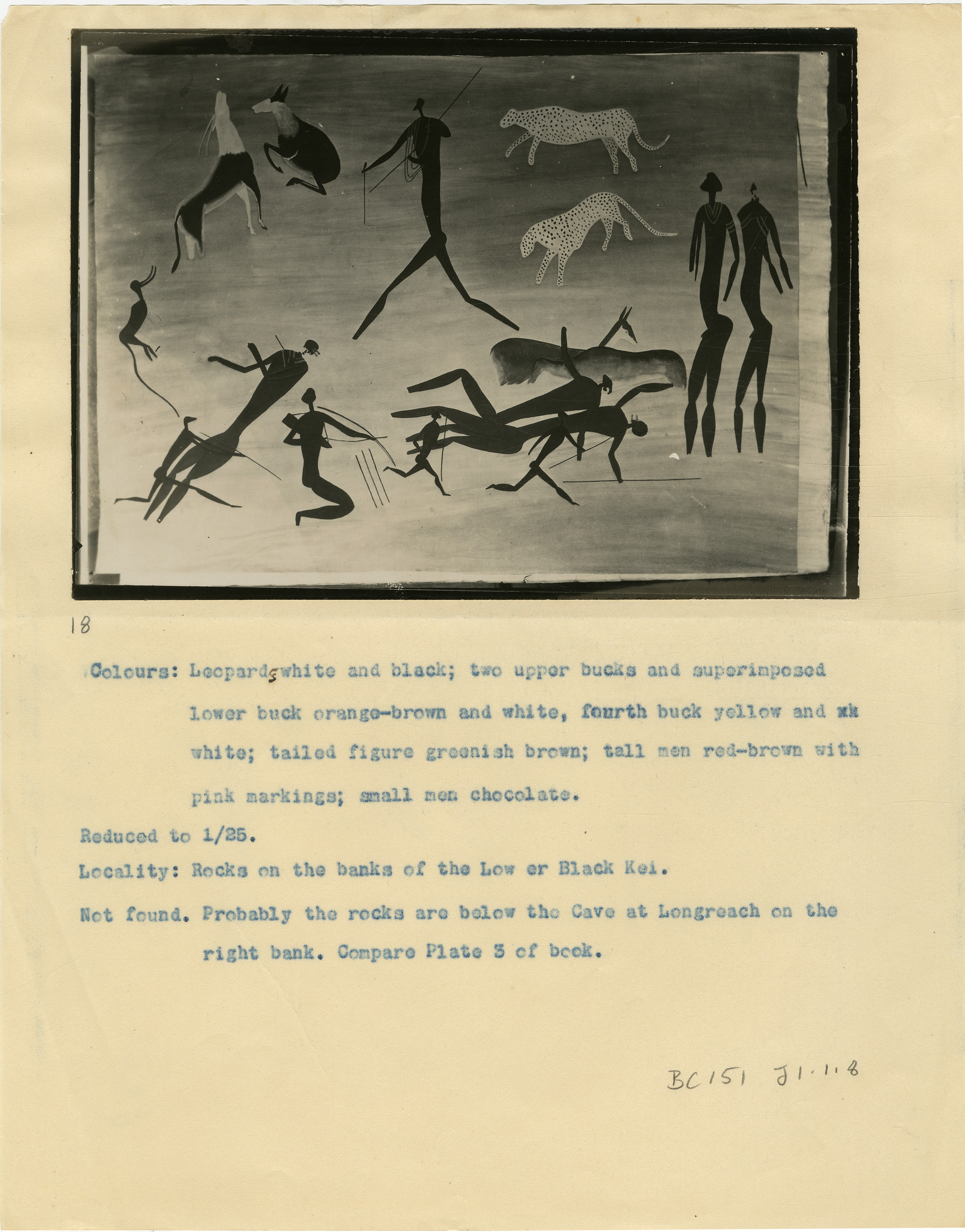 Page numbered '18' in pencil. Typewritten caption: 'Colours: Leopard white and black; two upper bucks and superimposed lower buck orange-brown and white, fourth buck yellow and white; tailed figure greenish brown; tall men red-brown with pink markings; small men chocolate. Reduced to 1/25. Locality: Rocks on the banks of the Lower Black Kei. Not found. Probably the rocks are below the Cave at Longreach on the right bank. Compare Plate 3 of book.' An 's' has been added to 'Leopard' in pencil. Additional text: 'BC151 J1.1.8'.