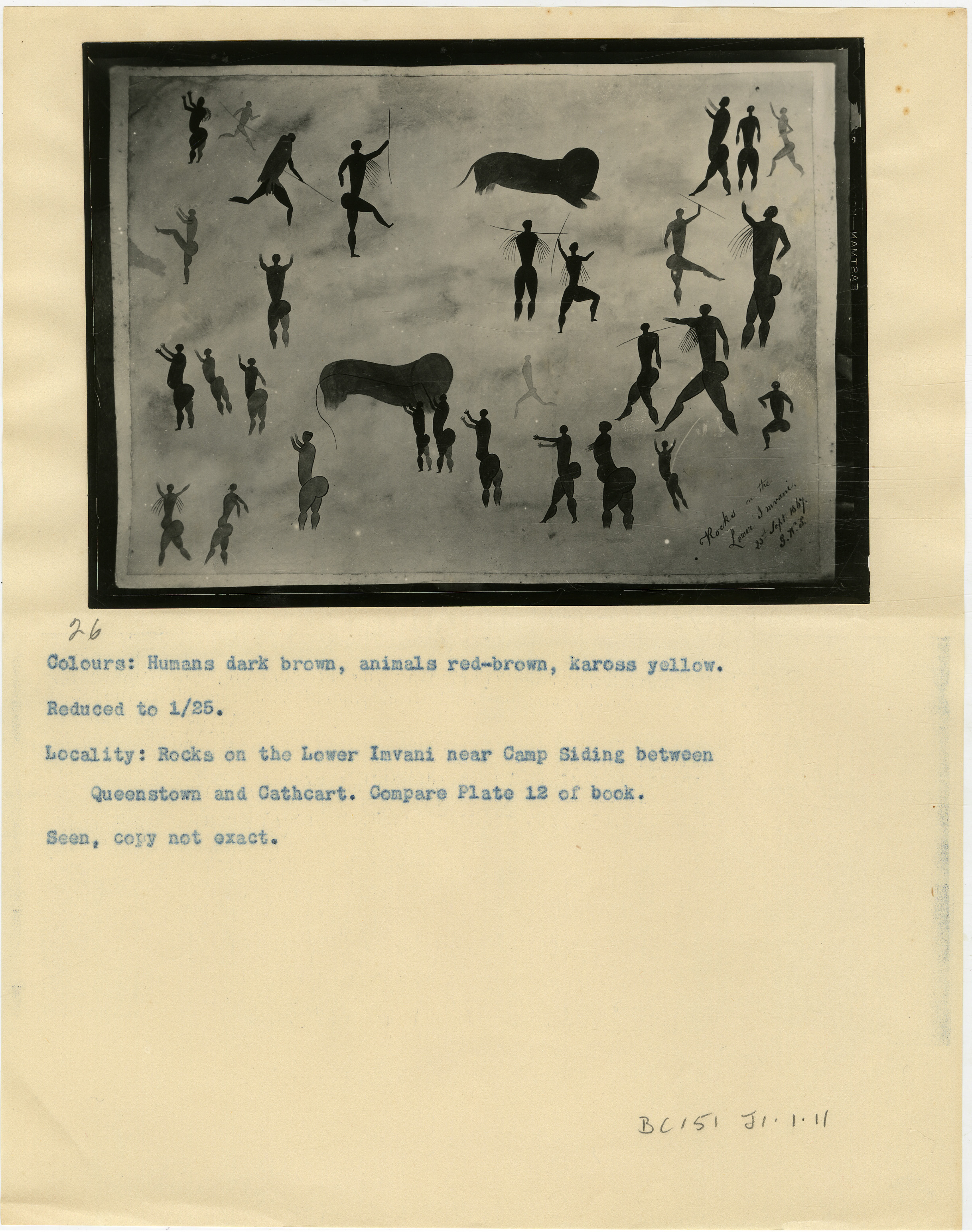 Page is numbered '26' in pencil. Typewritten caption: 'Colours: Humans dark brown, animals red-brown, kaross yellow. Reduced to 1/25. Locality: Rocks on the Lower Imvani near Camp Siding between Queenstown and Cathcart. Compare Plate 12 of this book. Seen, copy not exact.' Additional text in pencil: 'BC151 J1.1.11'.