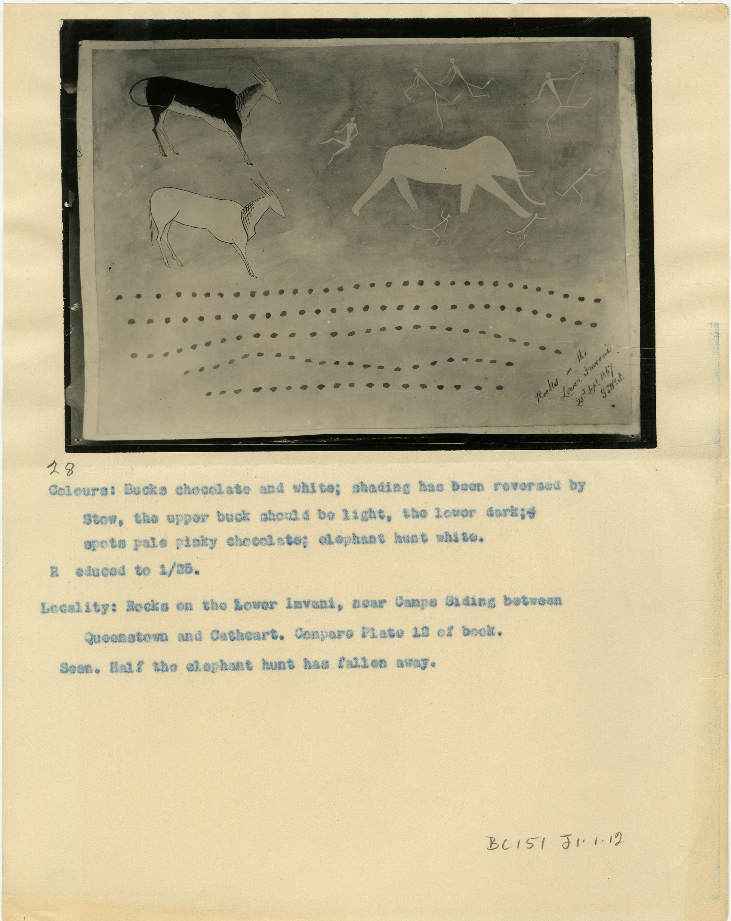 George Stow's original handwritten caption is visible. Page is numbered '28' in pencil. Typewritten caption: 'Colours: Bucks chocolate and white; shading has been reversed by Stow, the upper buck should be the light, the lower dark; spots pale pinky chocolate; elephant hunt white. Reduced to 1/25. Locality: Rock on the Lower Invani, near Camps Siding between Queenstown and Cathcart. Compare Plate 12 of book. See. Half of the elephant has fallen away.' Additional text: 'BC151 J1.1.12'.
