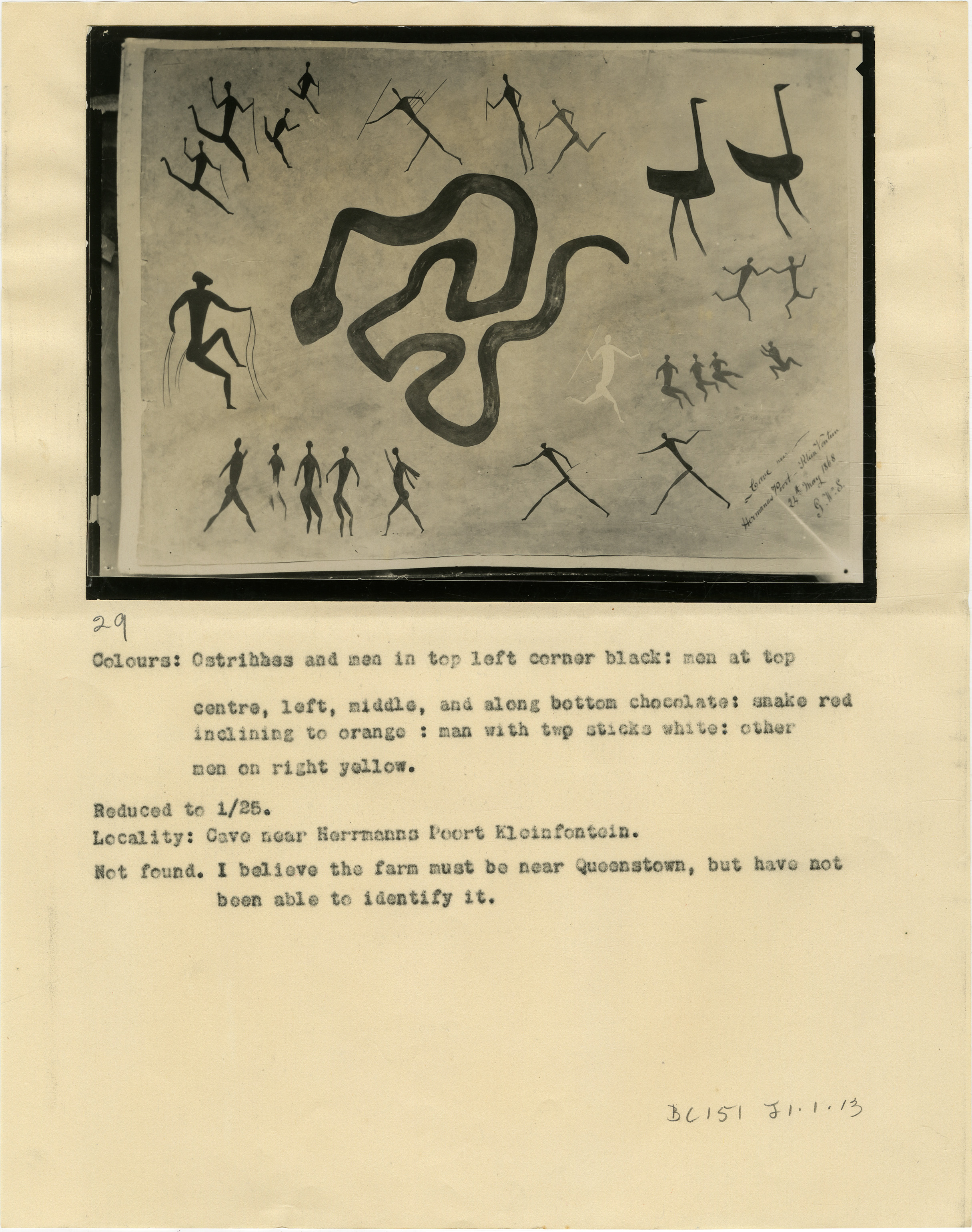 Stow's original caption is visible. Page is numbered '29' in pencil. Typewritten caption reads: 'Colours: Ostrihhss [sic] and men in top left corner black: men at top centre, left, middle, and along the bottom chocolate: snake red inclining to orange : man with two sticks white: other men on right yellow. Reduced to 1/25. Location: Cave near Herrmanns Poort Kleinfontein. Not found. I believe the farm must be near Queenstown, but have not been able to identify it.' Additional text in pencil: 'BC151 J1.1.13'.
