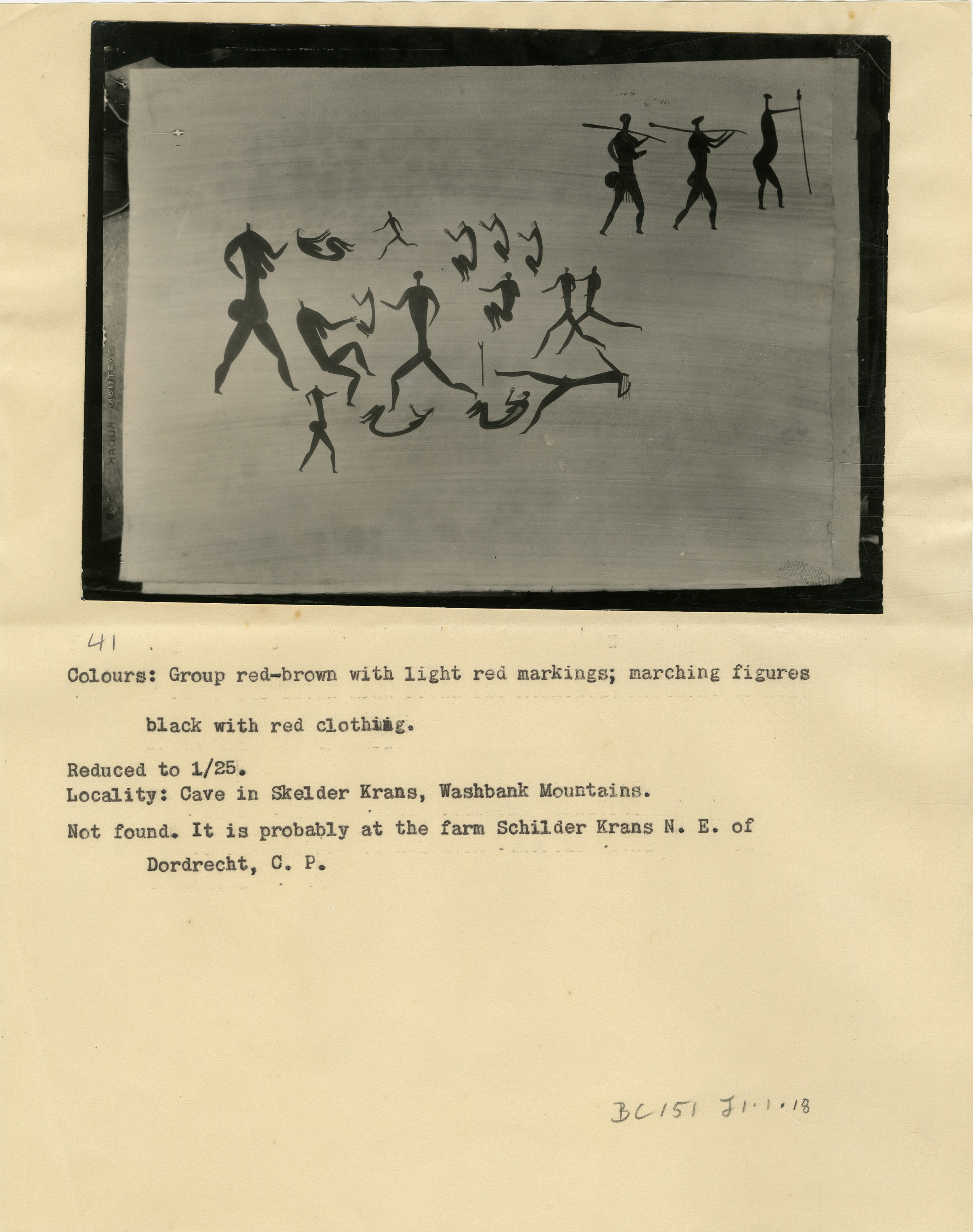 Page is numbered '41' in pencil. Typewritten caption reads: 'Colours: Group red-brown with light red markings; marching figures black with red clothing. Reduced 1/25. Locality: Cave in Skelder Krans, Washbank [sic] Mountains. Not found. It is probably at the farm Schil Krans N.E. of Dordrecht, C.P.' Additional text: 'BC151 J1.1.18'.