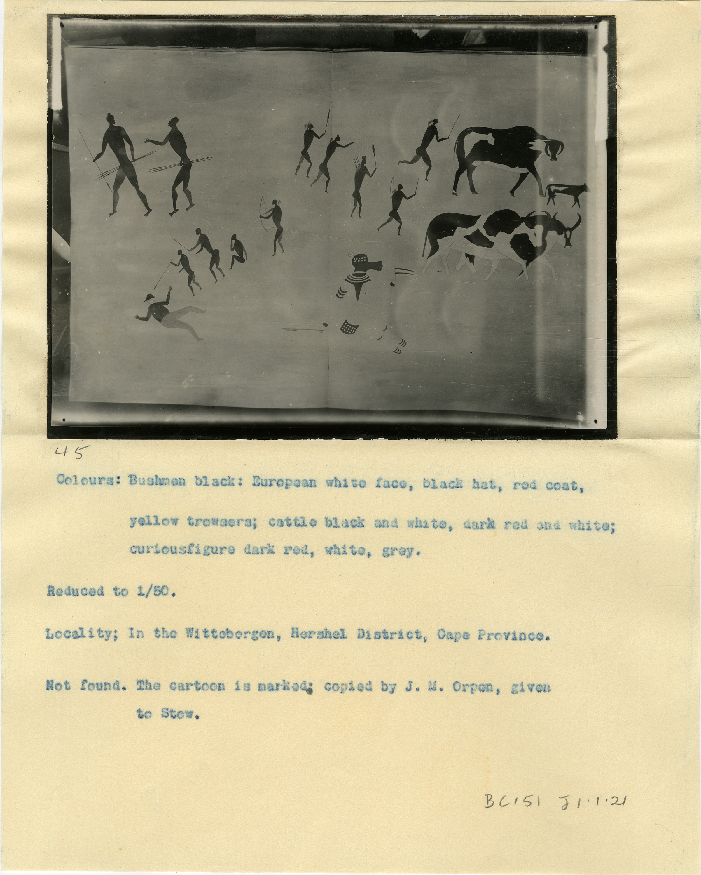 Page numbered '45' in pencil. Typewritten caption: 'Colours: Bushmen black: European white face, black hat, red coat, yellow trowsers [sic]; cattle black and white, dark red and white; coriousfigure [sic] dark red, white, grey. Reduced to 1/50. Locality; In Wittebergen, Herschel District, Cape Province. Not found. The cartoon is marked; copied by J.M. Orphen, given to Stow.' Additional text in pencil: 'BC151 J1.1.21'.