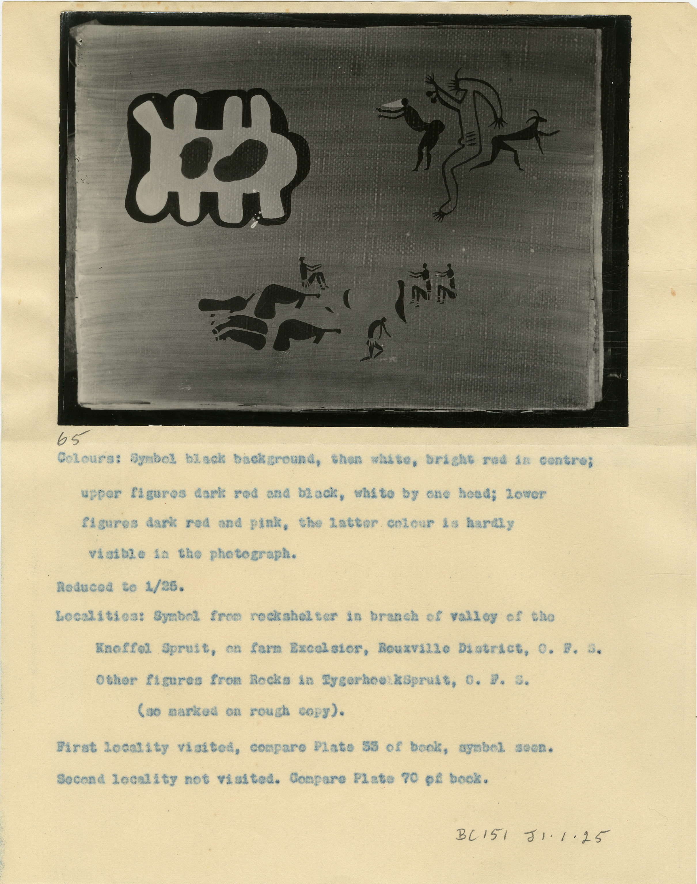 Numbered '65' in pencil. Typewritten caption: 'Colours: Symbol black background, then white, bright red in centre upper figures dark red and black, white by one head; lower figures dark red and pink, the latter colour is hardly visible in the photograph. Reduced to 1/25. Localities: Symbol from rockshelter in branch of valley of the Knoffel Spruit, on farm Excelsior, Rouxville District, O.F.S. (so marked on rough copy). First locality visited, compare Plate 33 of book, symbol seem. Second locality not visited. Compare Plate 70 of book.' Additional text: 'BC1515 J1.1.25'.