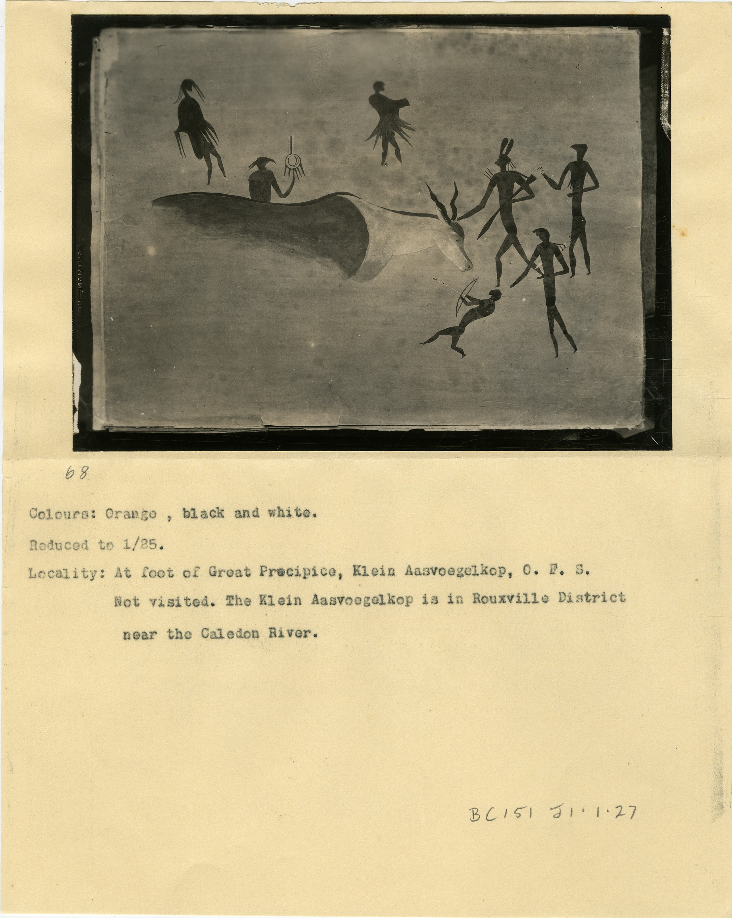 Numbered '68' in pencil. Typewritten caption: 'Colours: Orange, black and white, Reduced to 1/25. Locality: At foot of Great Precipice, Klein Aasvoegelkop, O.F.S. Not visited. The Klein Aasvoegelkop is in Rouxville District near the Caledon River.' Additional text: 'BC1515 J1.1.27'.