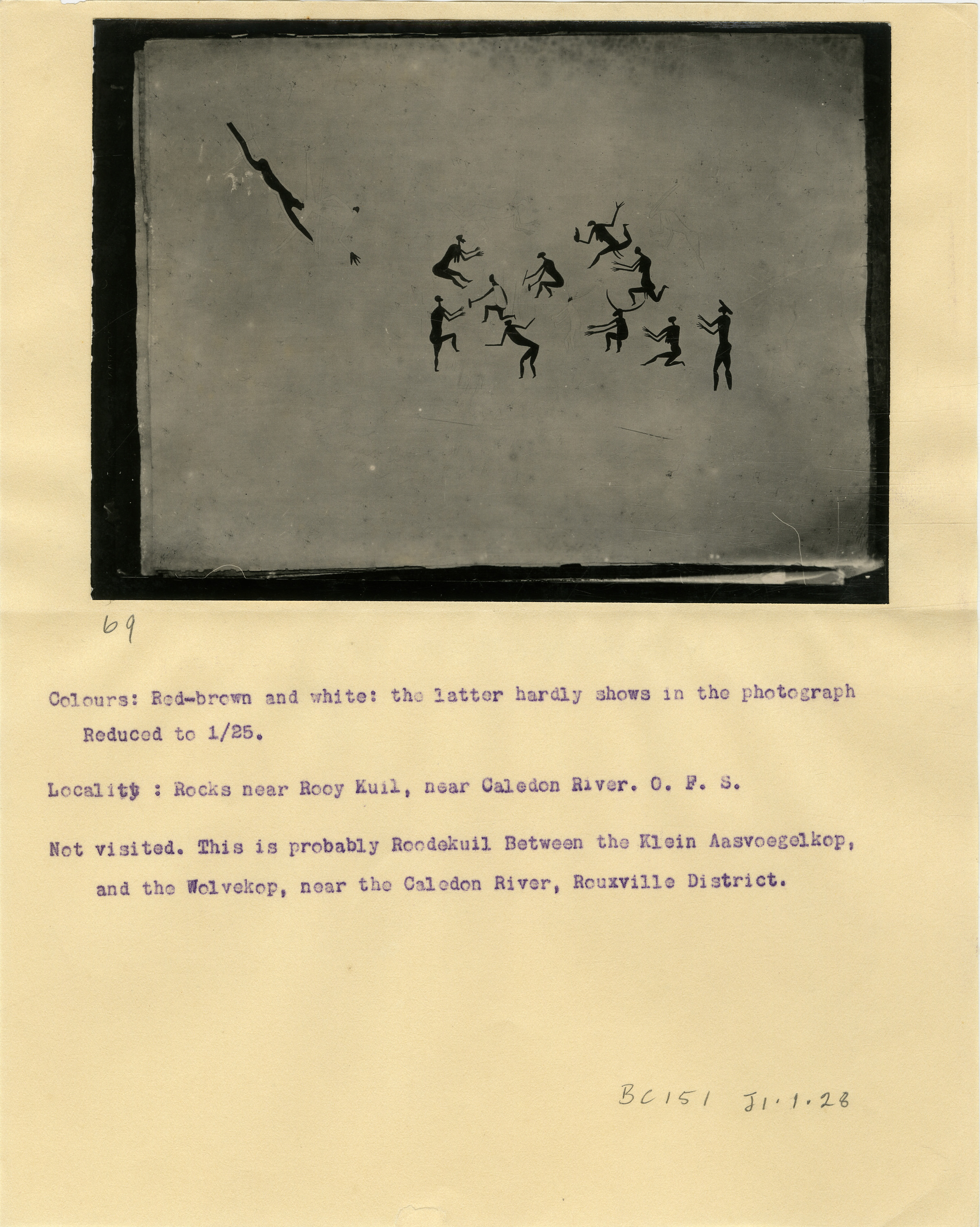 Photographic print of a reproduction of rock art produced by George Stow with typewritten notes by Dorothea Bleek.