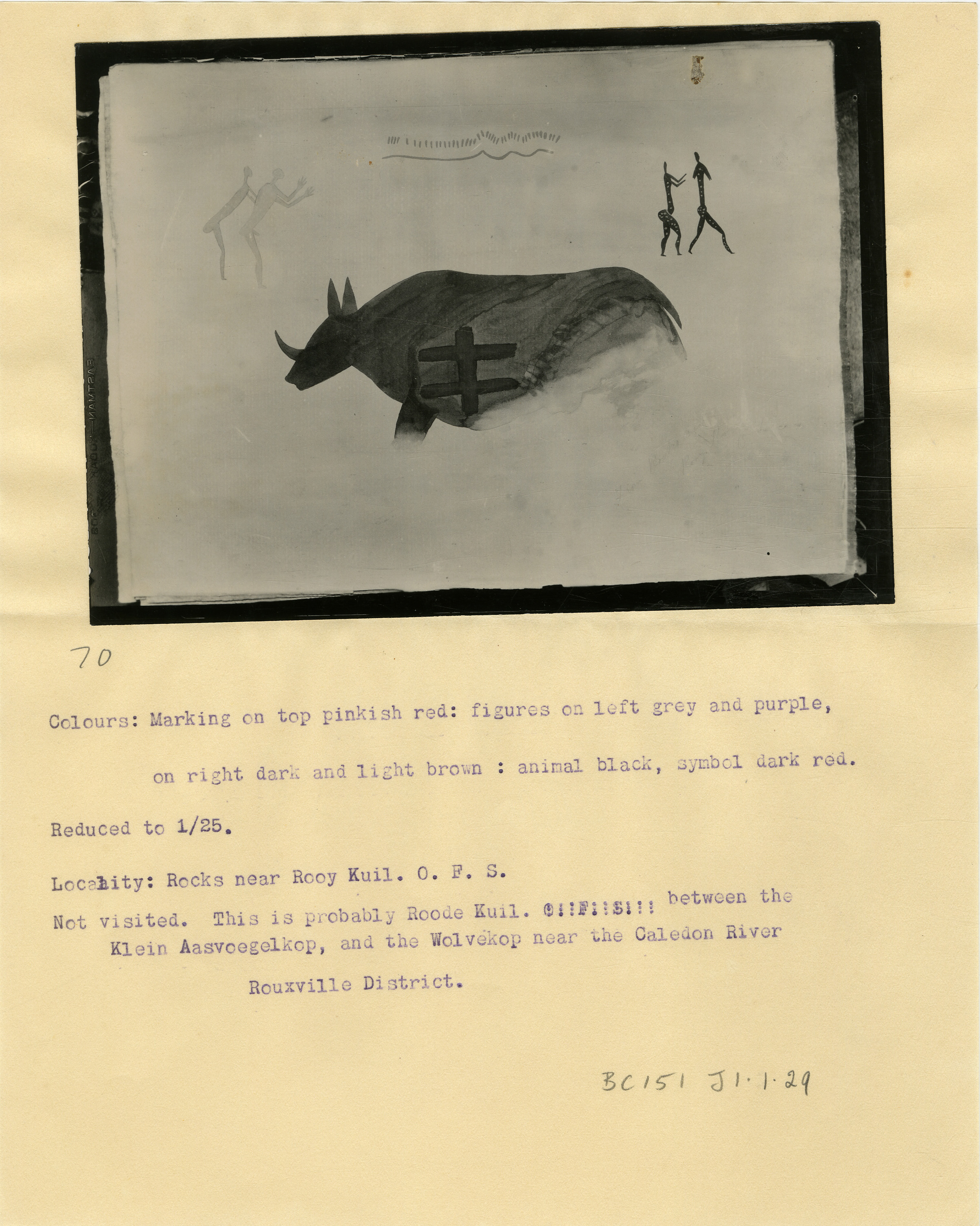 Page is numbered '70' in pencil. Typewritten caption: 'Colour: Markings on top pinkish red: figures on left grey and purple, on right dark and light brown: animal black, symbol dark red. Reduced to 1/25. Locality: Rocks near Rooy Kuil. O.F.S. Not visited. This is probably Roode Kuil between the Klein Aasvoegelkop, and the Wolvekop [sic] near the Caledon River Rouxville District'. Additional text in pencil: 'BC151 J1.1.29'.