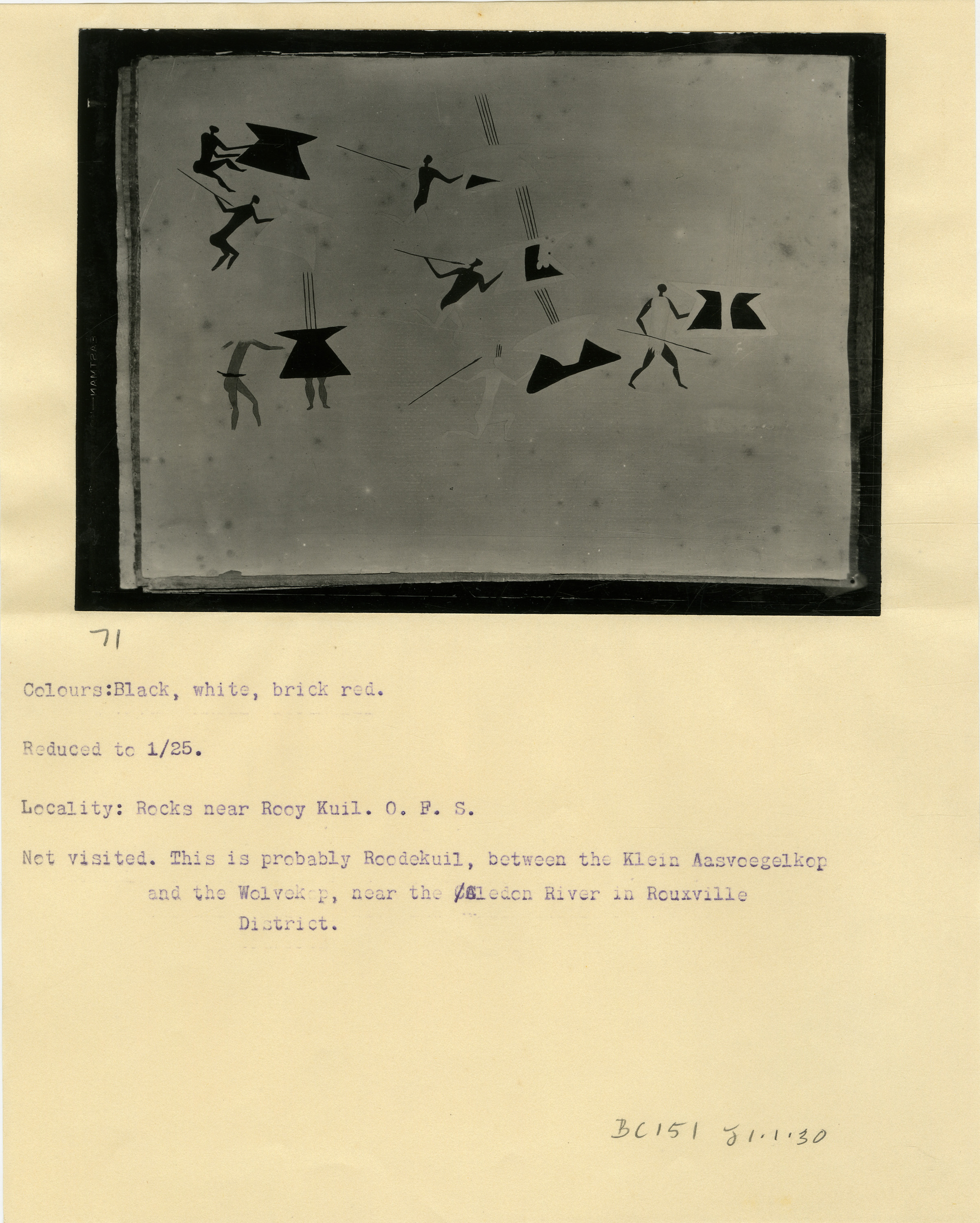 Page is numbered '71' in pencil. Typewritten caption: 'Colours: Black, white, brick red. Reduced to 1/25. Locality: Rocks near Rooy Kuil. O.F.S. Not visited. This is probably Roodekuil, between the Klein Aasvoegelkop and the Wolvekop, near the Caledon River in Rouxville District.' Additional text in pencil: 'BC151 J1.1.30'.