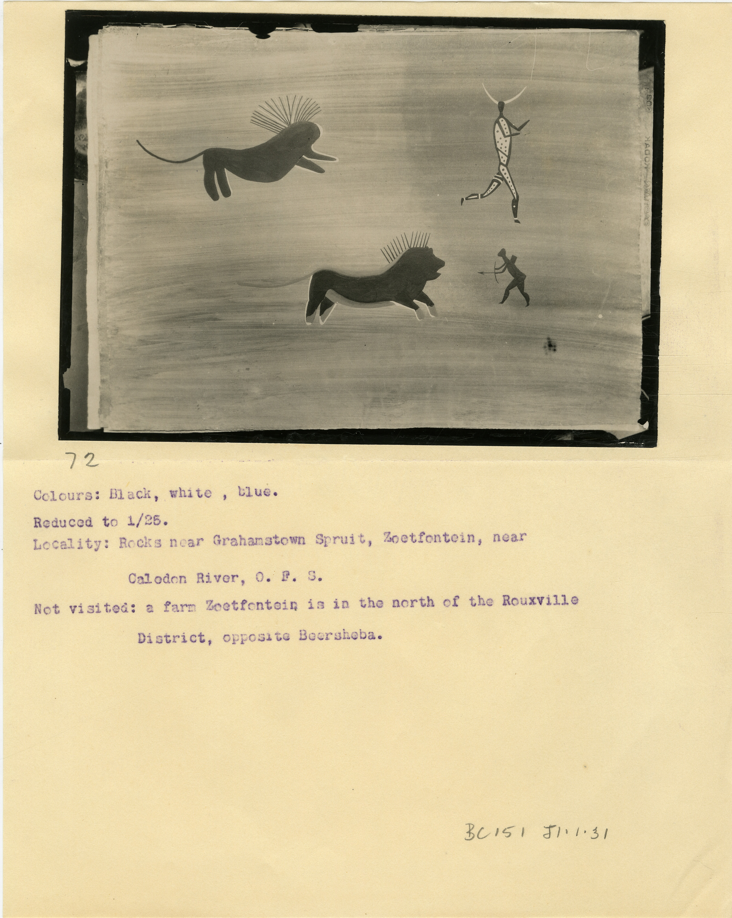Page is numbered '72' in pencil. Typewritten caption: 'Colours: Black, white, blue. Reduced to 1/25. Locality: Rocks near Grahamstown Spruit, Zoetfontein, near Caledon River, O.F.S. Not visited: a farm Zoetfontein is in the north of Rouxville District, opposite Beersheba.' Additional text: 'BC1515 J1.1.31'.