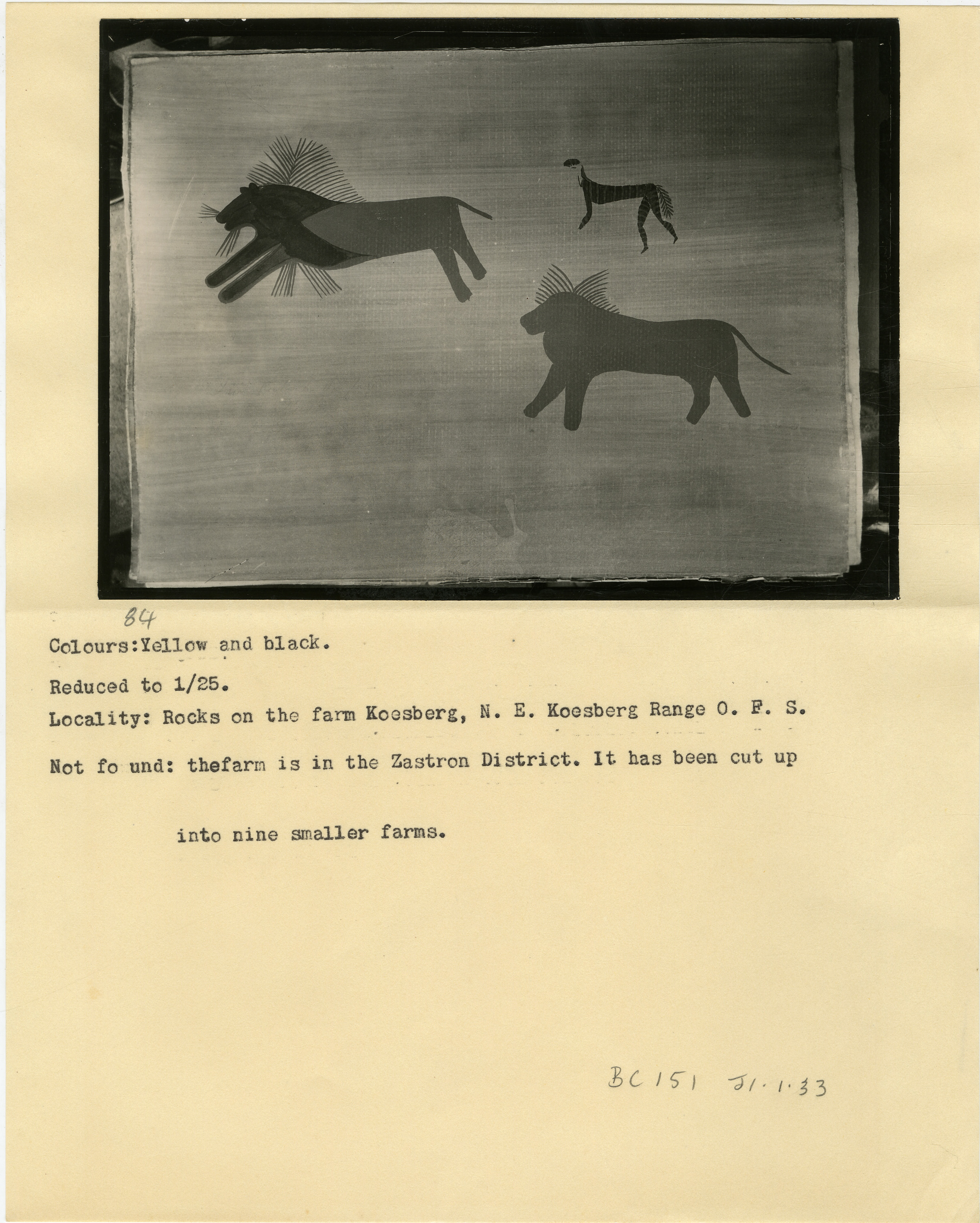 Page is numbered '84' in pencil. Typewritten caption: 'Colours:Yellow and black. Reduced to 1/25. Locality: Rocks on the farm Koesberg, N.E. Koesberg Range O.F.S. Not fo und [sic]: thefarm [sic] is in Zastron District. It has been cut up into nine smaller farm.' Additional text: 'BC 151 J1.1.33'.
