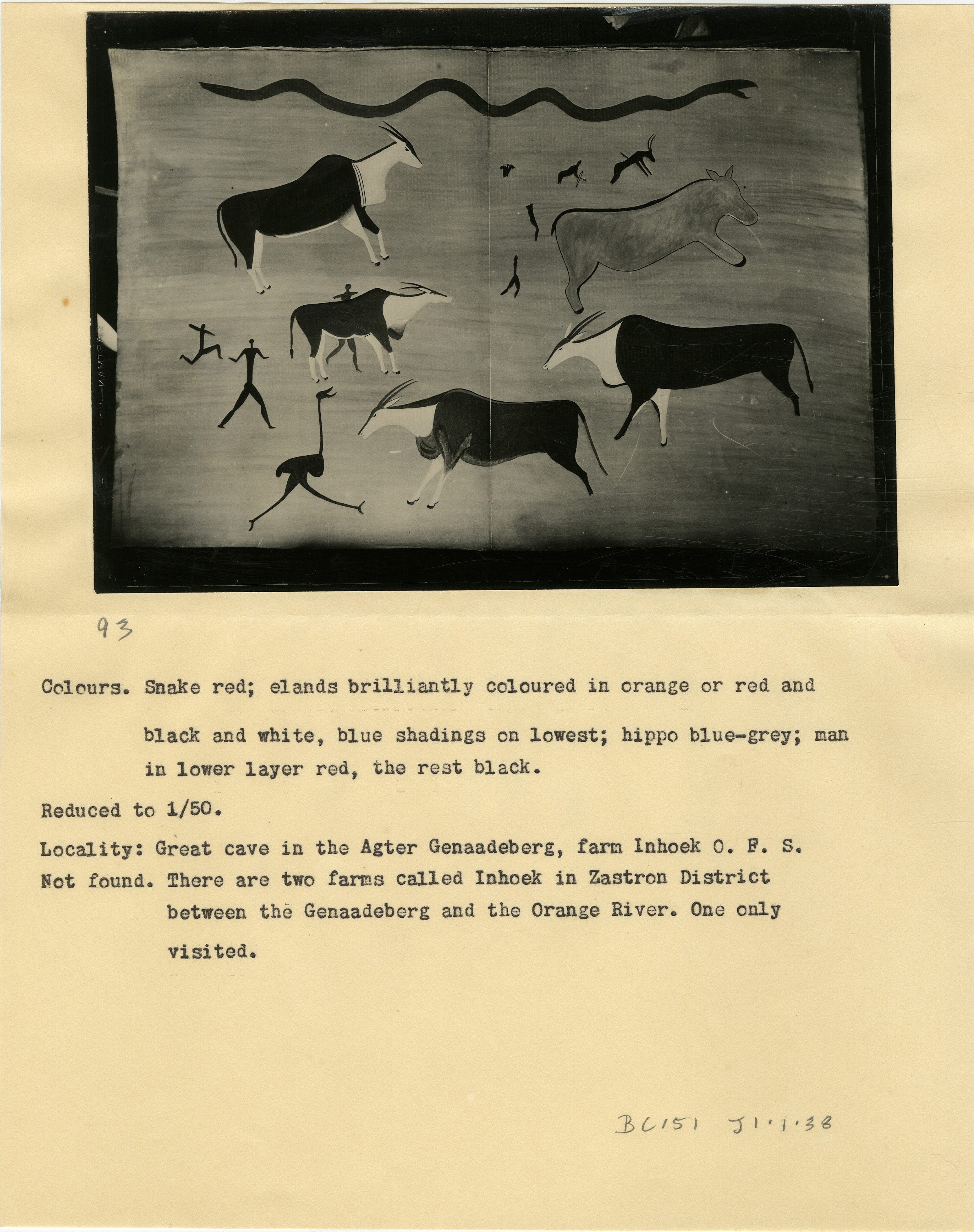 Page is numbered '93' in pencil. Typewritten caption: 'Colours. Snake red; elands brilliantly coloured in orange or red and black and white, blue shadings on lowest; hippo blue-grey; man in lower layer red, the rest black. Reduced 1/50. Locality: Great cave in the Agter Genaadeberg, farm Inhoek O.F.S. Not found. There are two farms called Inhoek in Zastron District between Genaadeberg and the Orange River. One only visited.' Additional text: 'BC151 J1.1.38'.