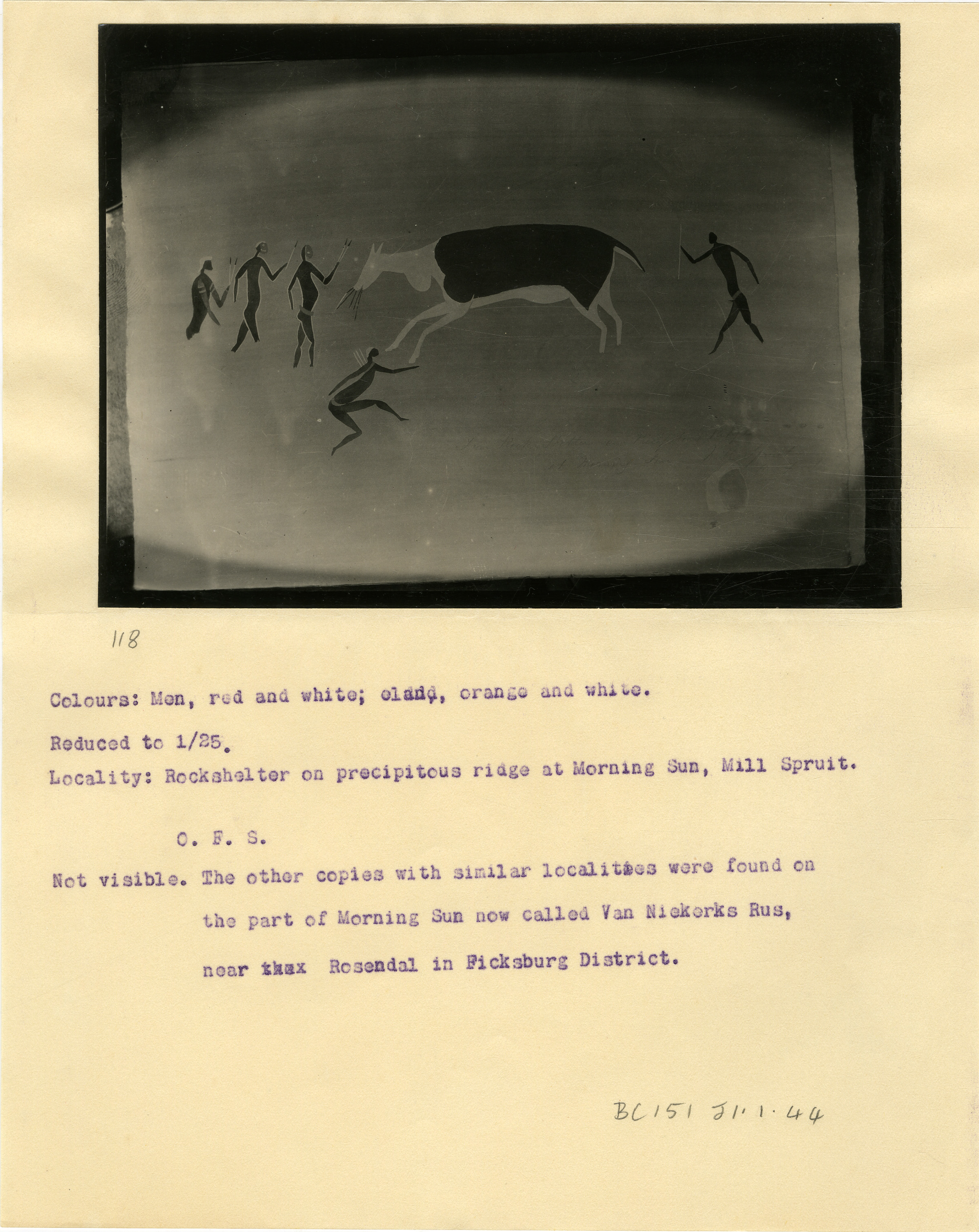 Page is numbered '118' in pencil. Typewritten caption: 'Colours: Men, red and white; eland, orange and white. Reduced to 1/25. Locality: Rockshelter on precipitous ridge at Morning Sun, Mill Spruit. O.F.S. Not visible. The other copies with similar localities were found on the part of Morning Sun now called Van Niekerks Rus, near Rosendal in Ficksburg District.' Additional text: 'BC151 J1.1.44'.