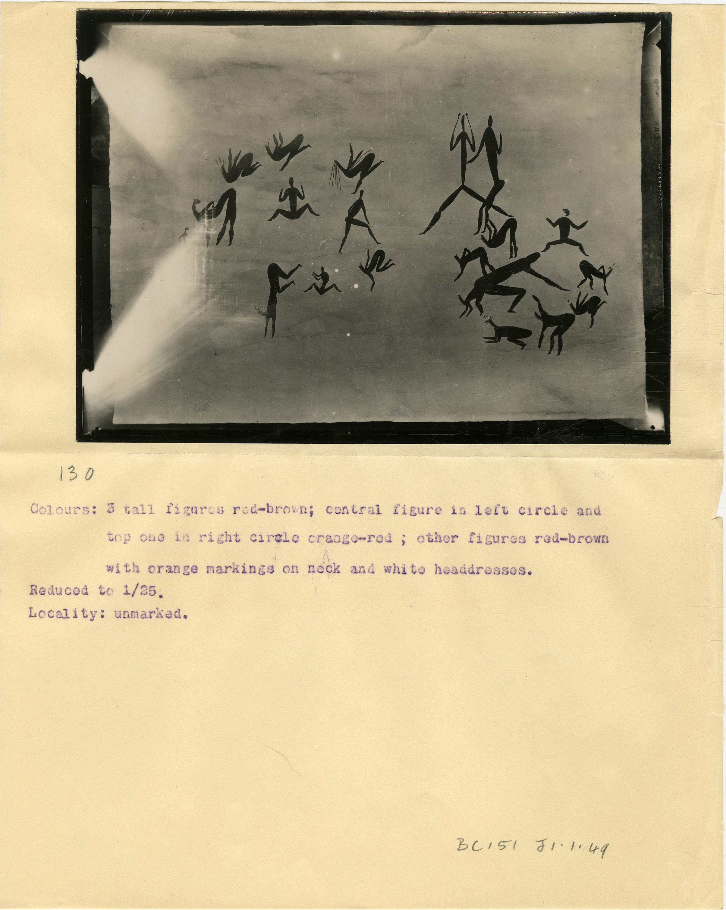 Page numbered '130' in pencil. Typewritten caption: 'Colours: 3 tall figures red-brown; central figure in left circle and top one in right circle orange-red; other figures red-brown with orange markings on neck and white headdresses. Reduced to 1/25. Locality: unmarked.' Additional text: 'BC151 J1.1.49'.