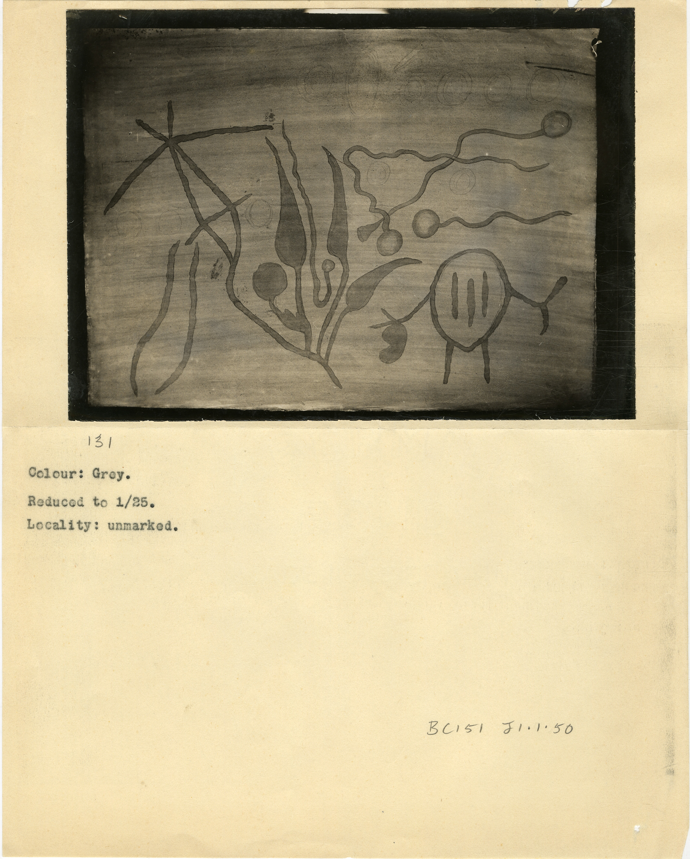 Page numbered '131' in pencil. Typewritten caption: 'Colour: Grey. Reduced to 1/25. Locality: unmarked.' Additional text: 'BC151 J1.1.50'.
