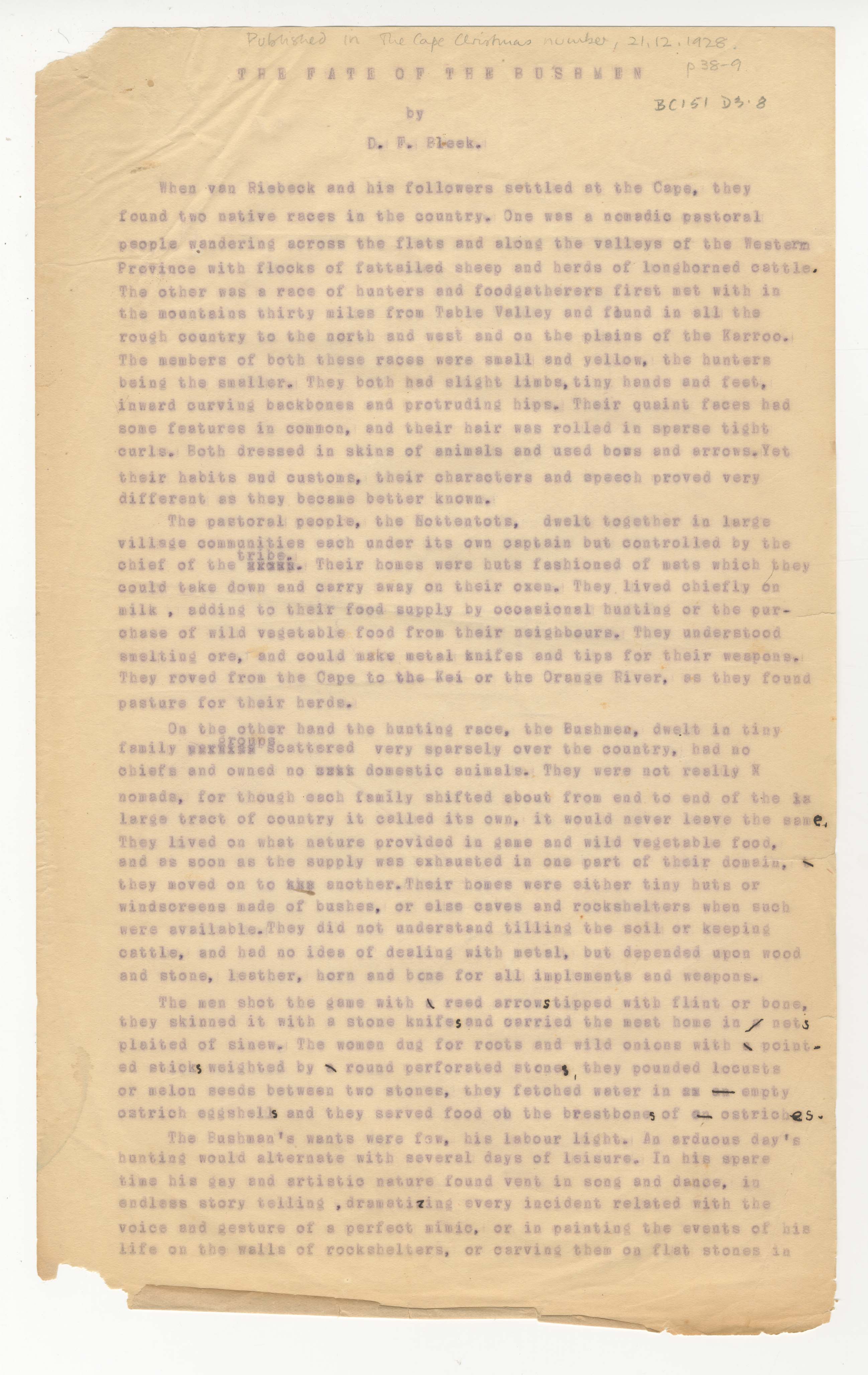 Page 1 of Dorothea Bleek's Cape Times article entitled 'The Fate of the Bushmen'. A handwritten pencil note (in English) above the article's title reads: 'Published in the Cape [Times] Christmas number 21.12.1928. p38-9'.
