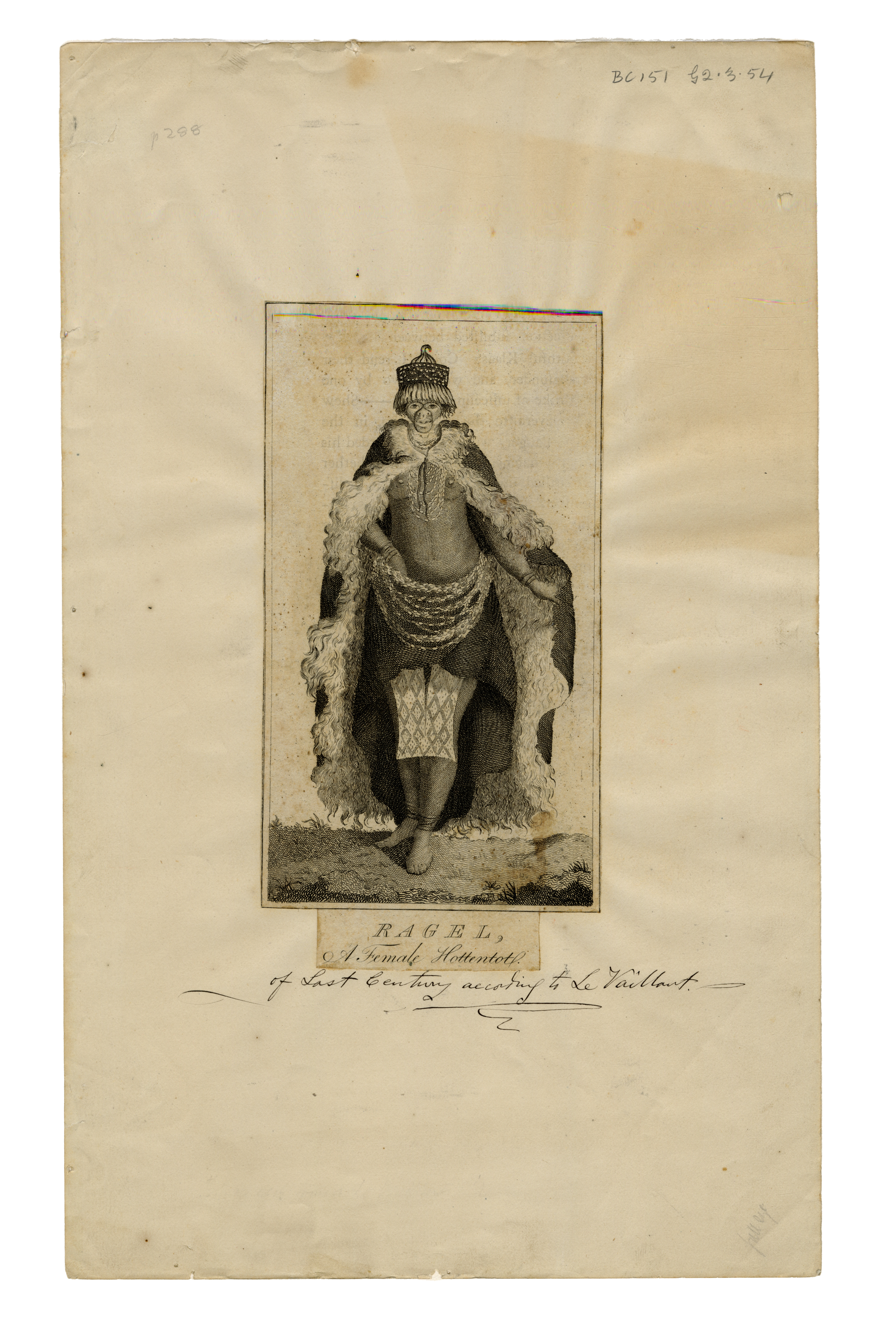 The illustrator for 'Ragel, A Female Hottentot' from François Le Vaillant's 'Travels into the interior of Africa' (1790) is unnamed in the available sources, but the image was published with the first edition of the book in 1790. The engraving was possibly done by Perrier (for maps), Van-Leen (for animals), Reinold (for birds), or another engraver who worked with Le Vaillant. Consult Ian Glenn's 'The Original Scene of Anthropology: Levaillant's Illustrations of Visiting the Gonaqua' (2020) in Visual Anthropology (33[4], pp. 301-312).