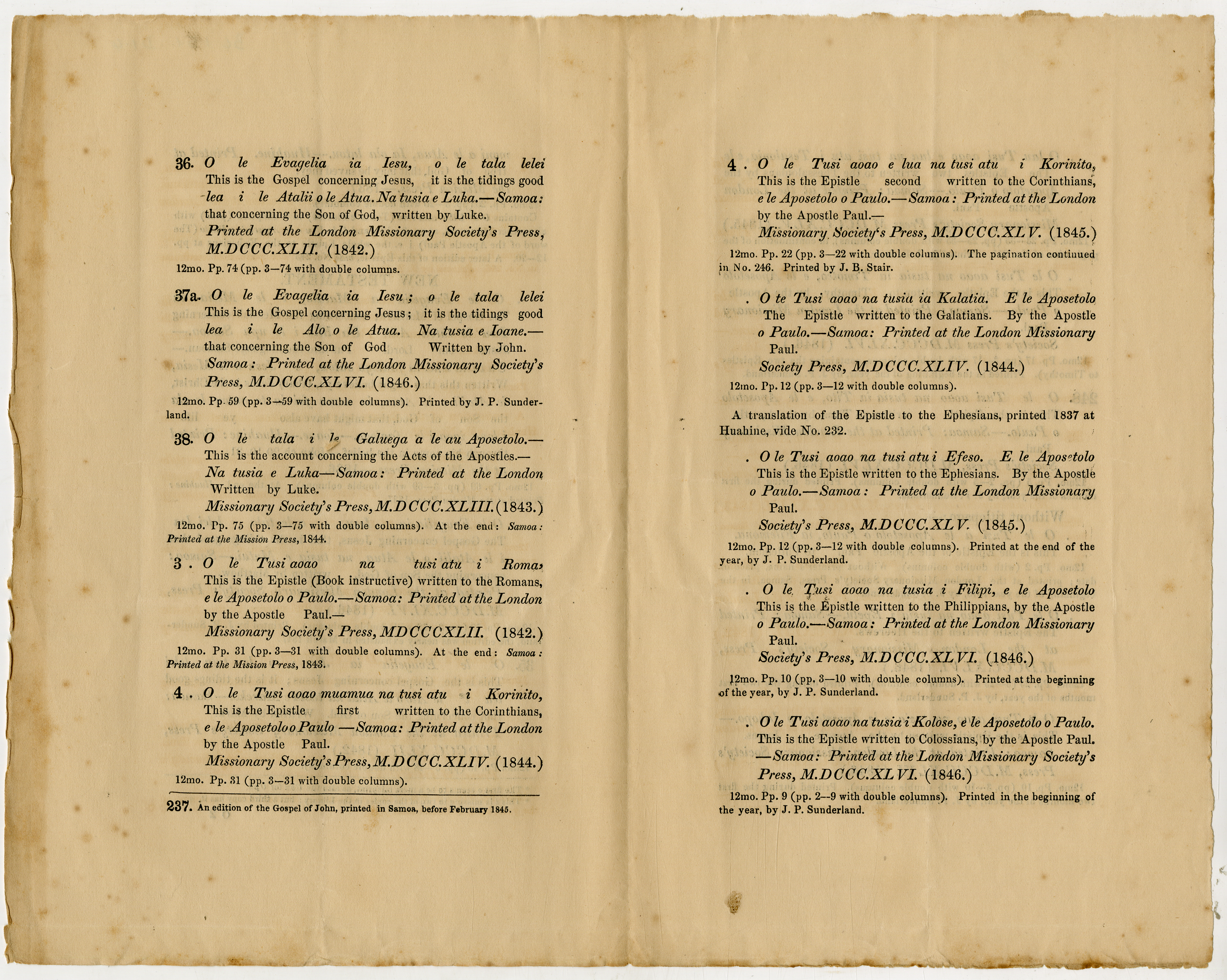 Printed text on the Samoan New Testament for WHI Bleek's Grey Library catalogue by Trübner and Co. of London. TSS.